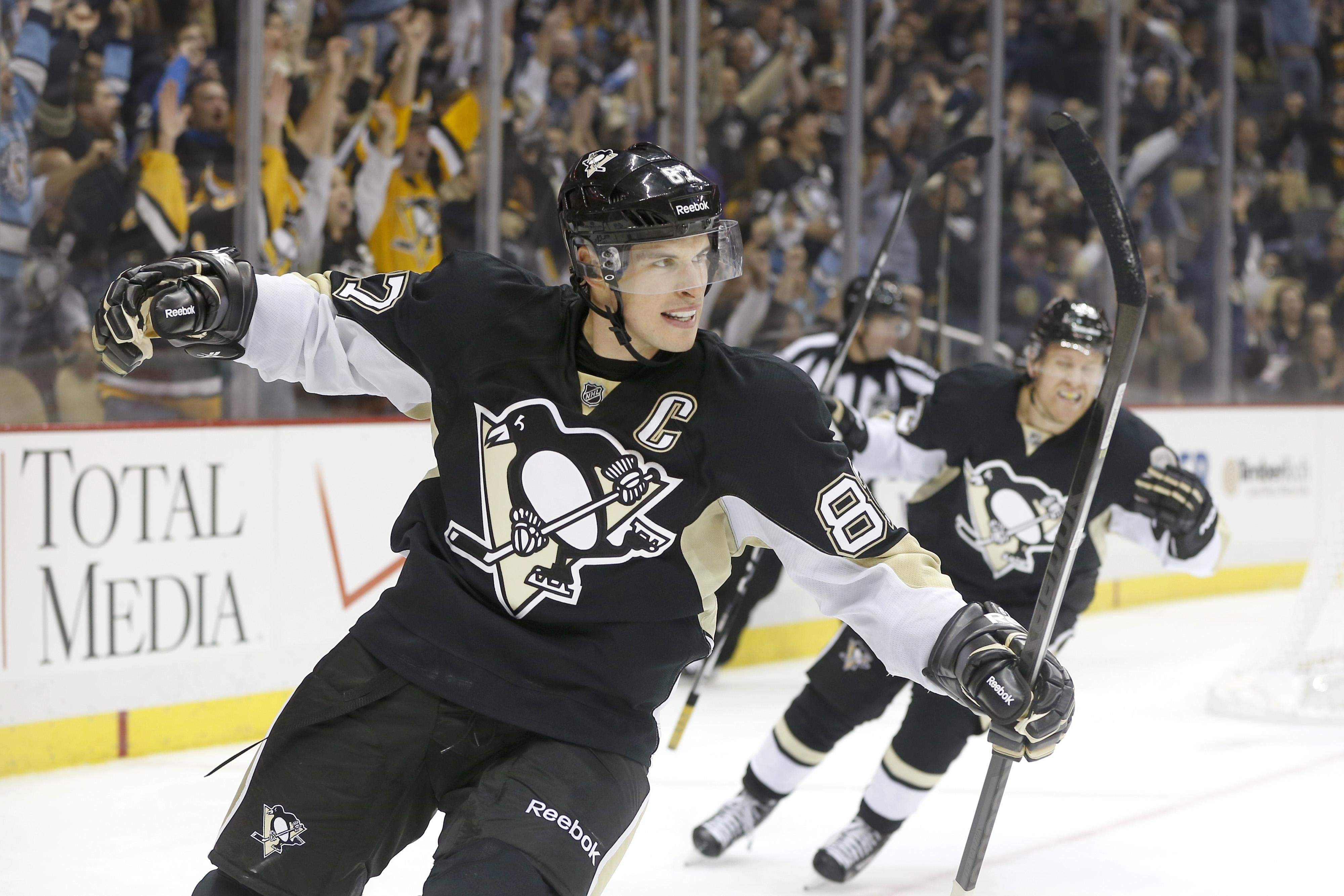 Description: A hockey player is celebrating after a goalie scored the game in the third period of a game against the penguins.