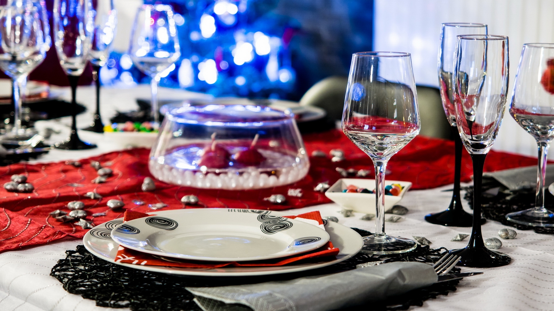 Description: A table set with glasses and plates for a holiday dinner or party with a red and black table cloth.
