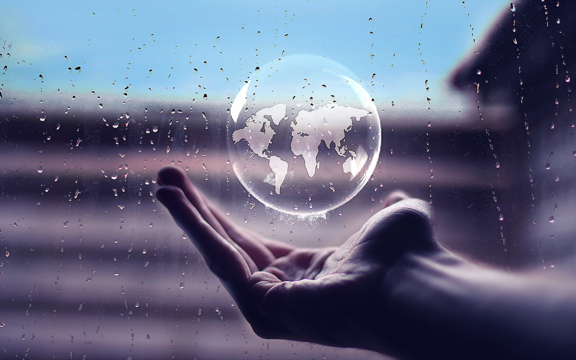 Description: A person holding a glass globe in their hand outside of a window with rain drops on it and a blue sky.