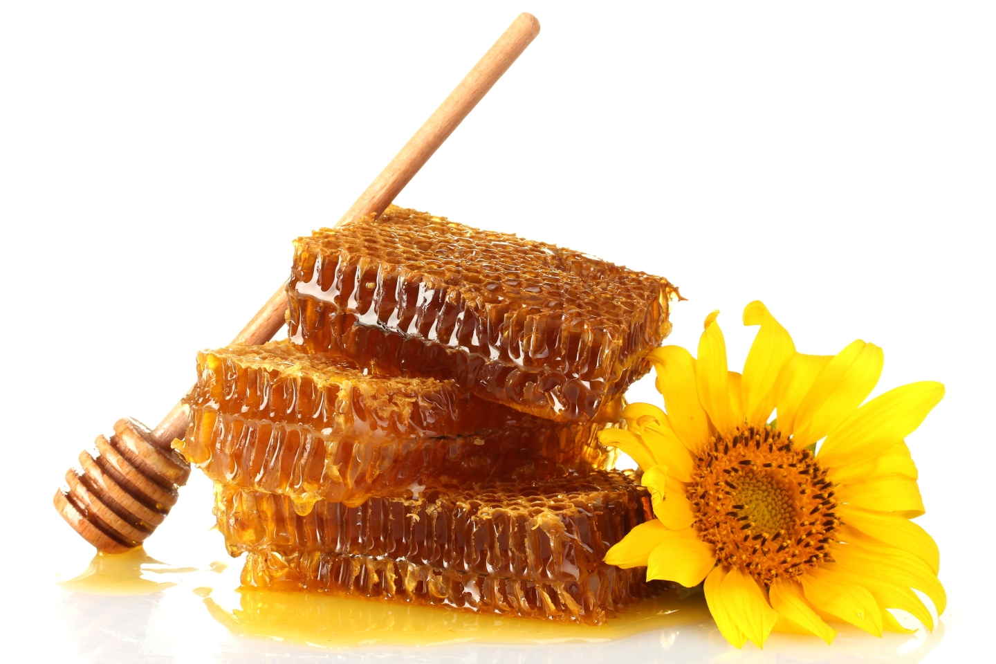 Description: A honey comb and a sunflower on a white background with a honey dipper and a honey dipper.