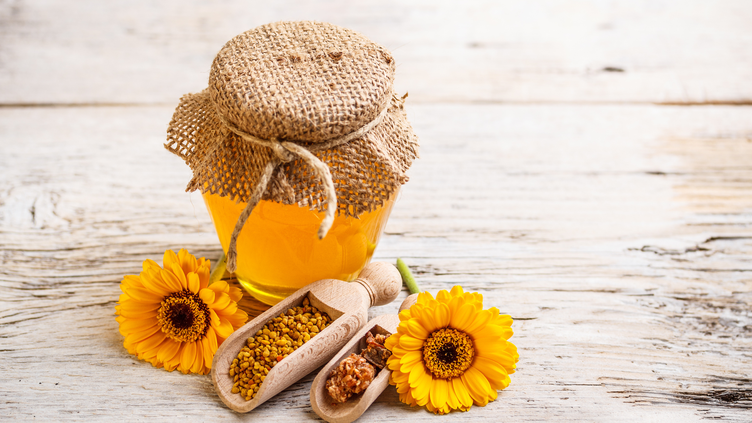 Description: A jar of honey and some sunflowers on a table with a spoon and spoon rest on the table.