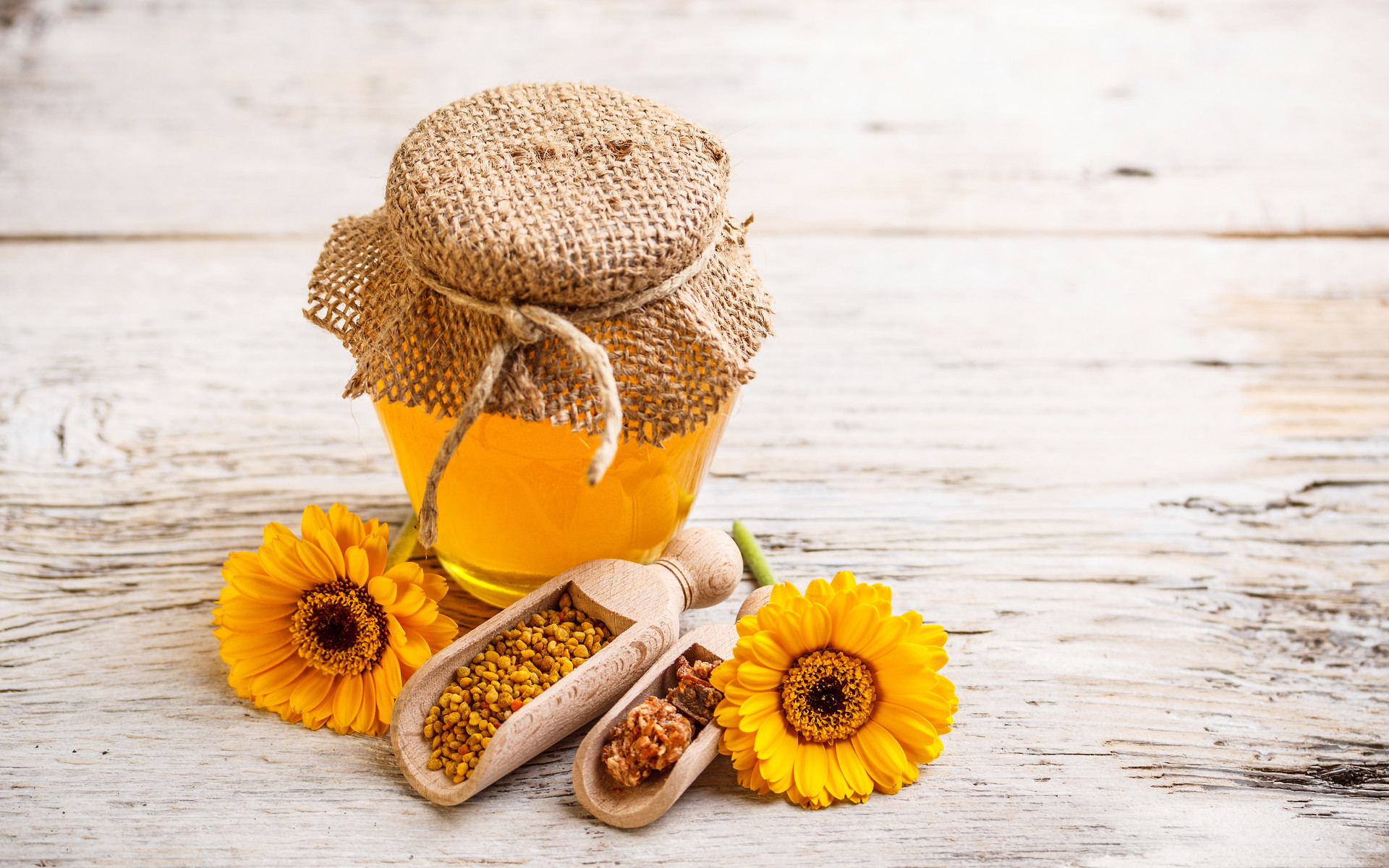 Description: A jar of honey and some sunflowers on a wooden table with a spoon and spoon rest on the ground.