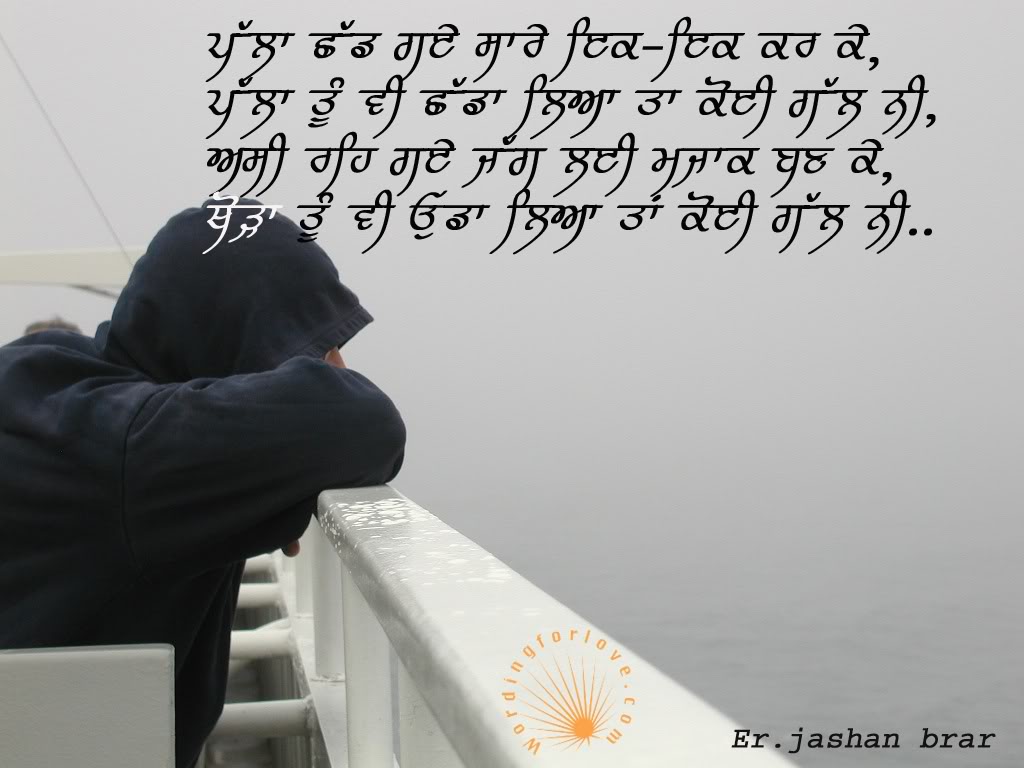 Description: A person in a hooded jacket looking out over a body of water with a quote written in a foreign language.