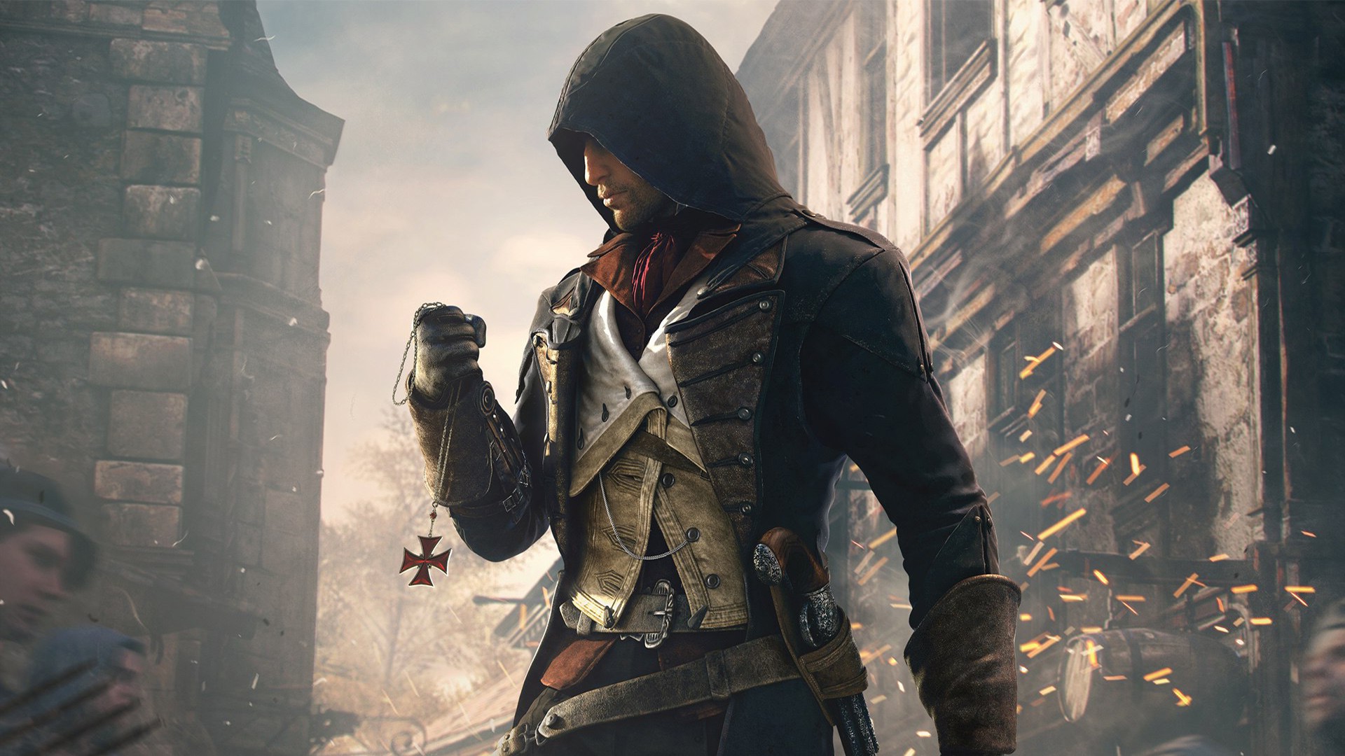 Description: A man in a hooded outfit holding a gun in a city street with people looking on in the distance.