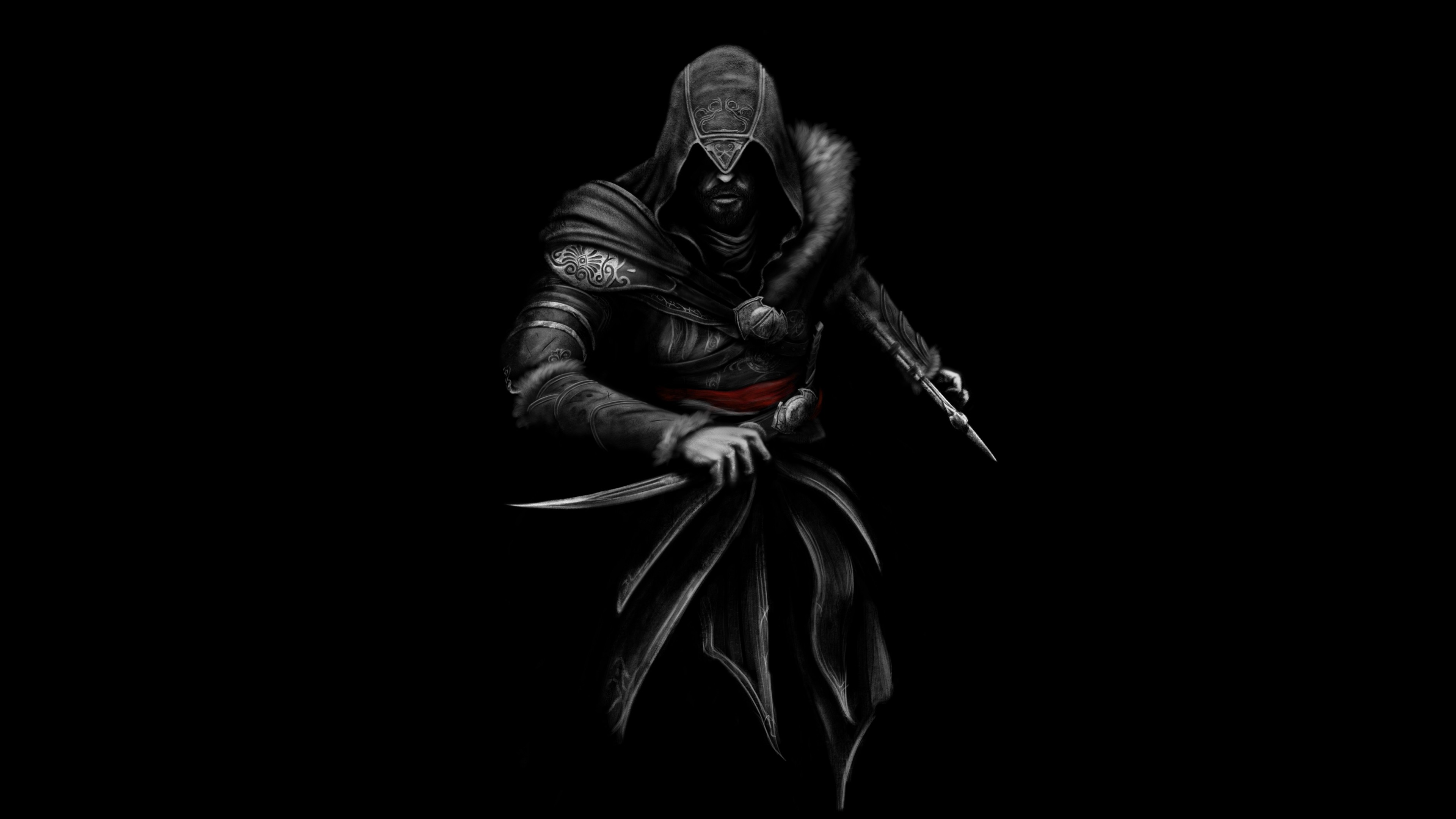 Description: A man in a hooded outfit holding a knife and a knife in his hand with a black background and a red stripe around his waist.
