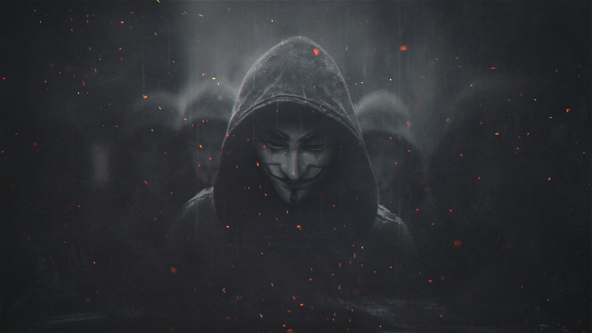 Description: A hooded man in a dark room with red lights coming from his eyes and a hood on his face.