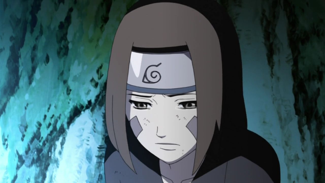 Description: A person with a hood on in a forest with trees and water behind them and a tree in the background.