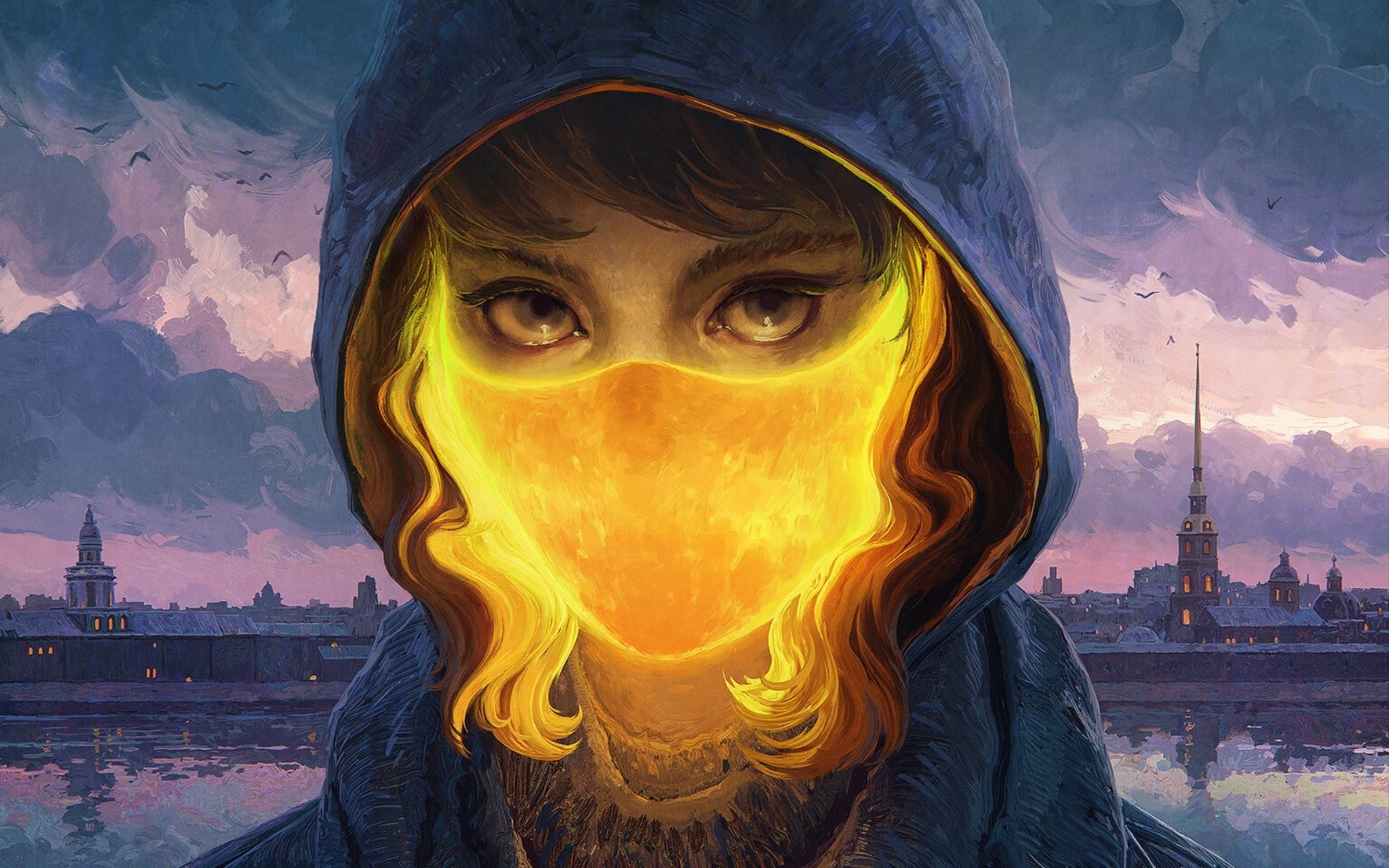Description: A man with a hoodie on and a fire in his face in front of a cityscape.