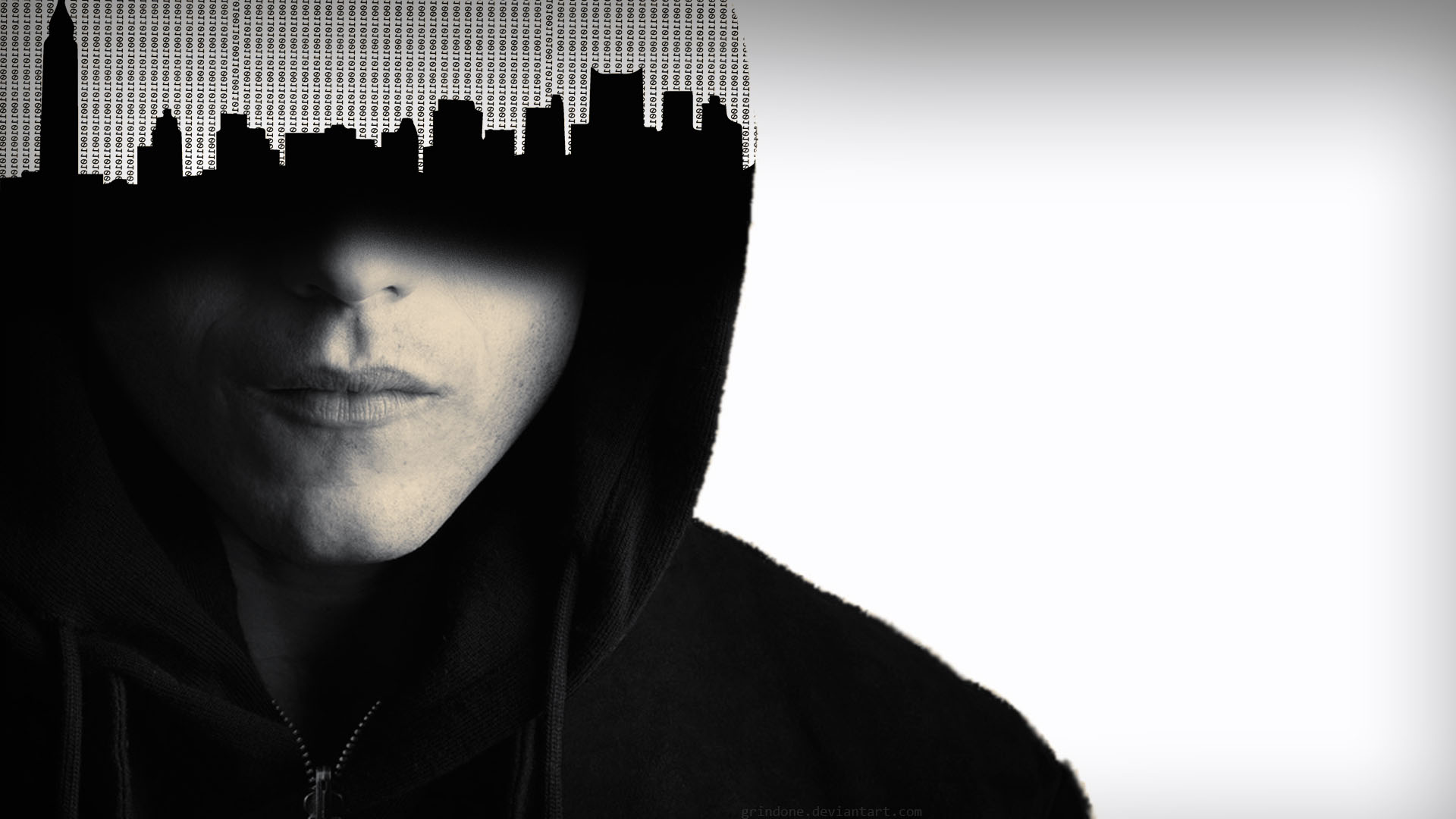 Description: A person with a hoodie on in front of a city skyline with skyscrapers in the background and a person with a hoodie on.