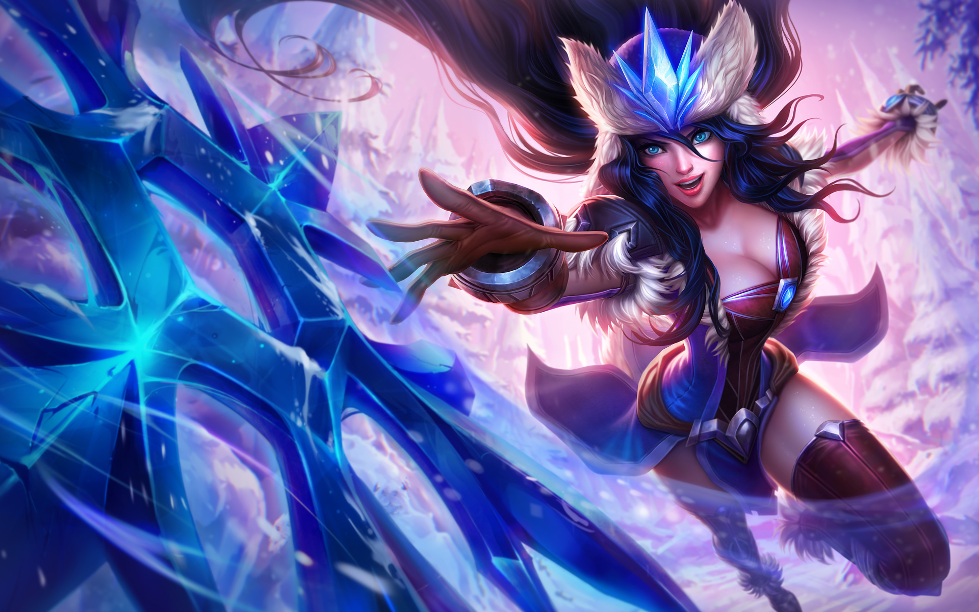 Description: A woman with a horned head and blue hair holding a sword in her hand and a blue ice background.