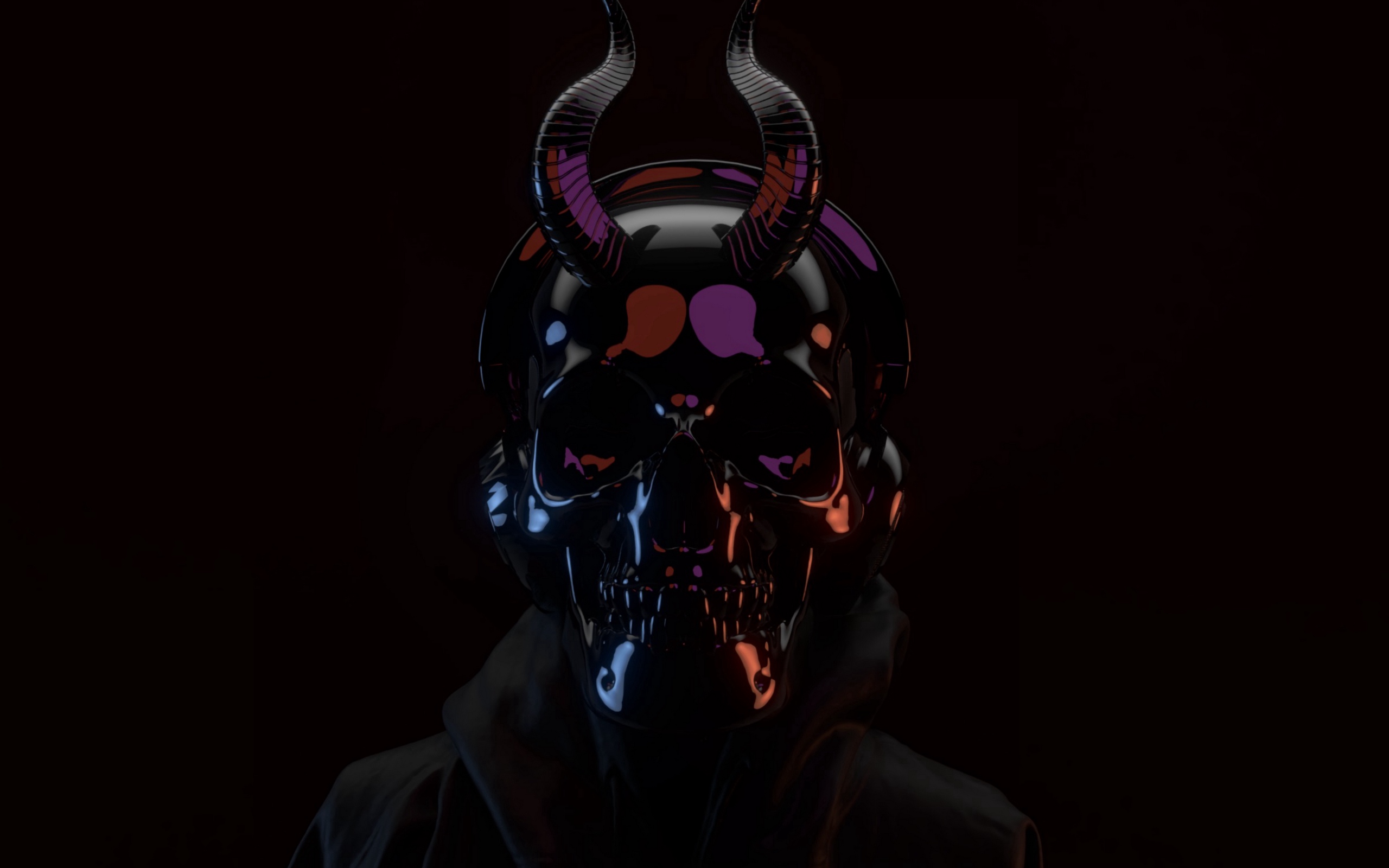 Description: A man with a horned head and horns on his face in the dark with a red light on his face.