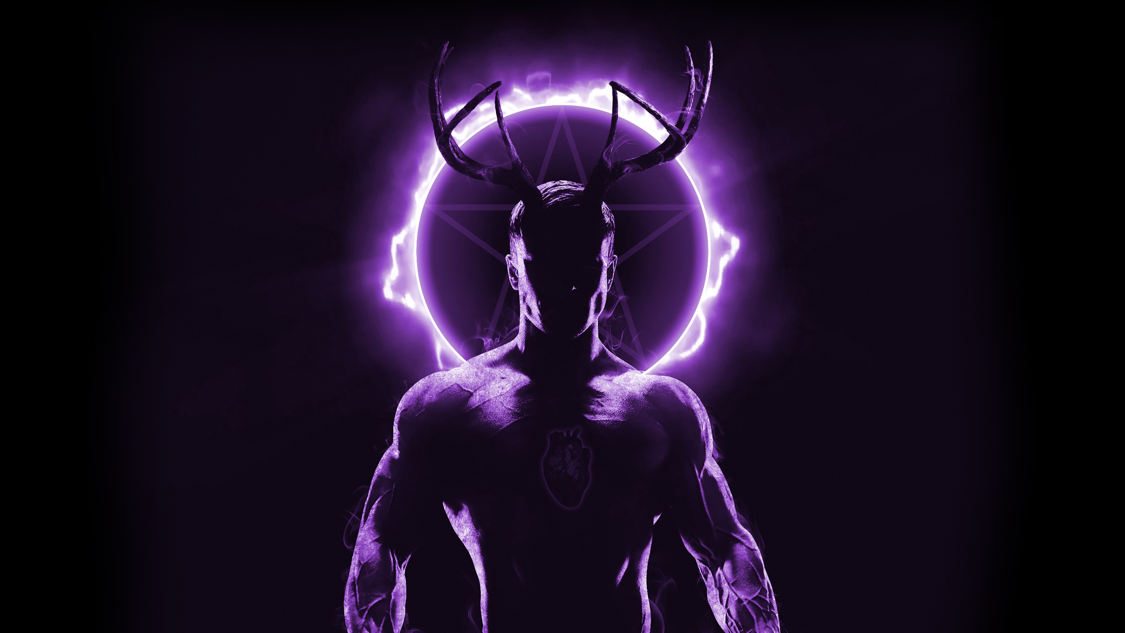 Description: A man with a horned head and horns in front of a purple background with lightning and a circle of light.