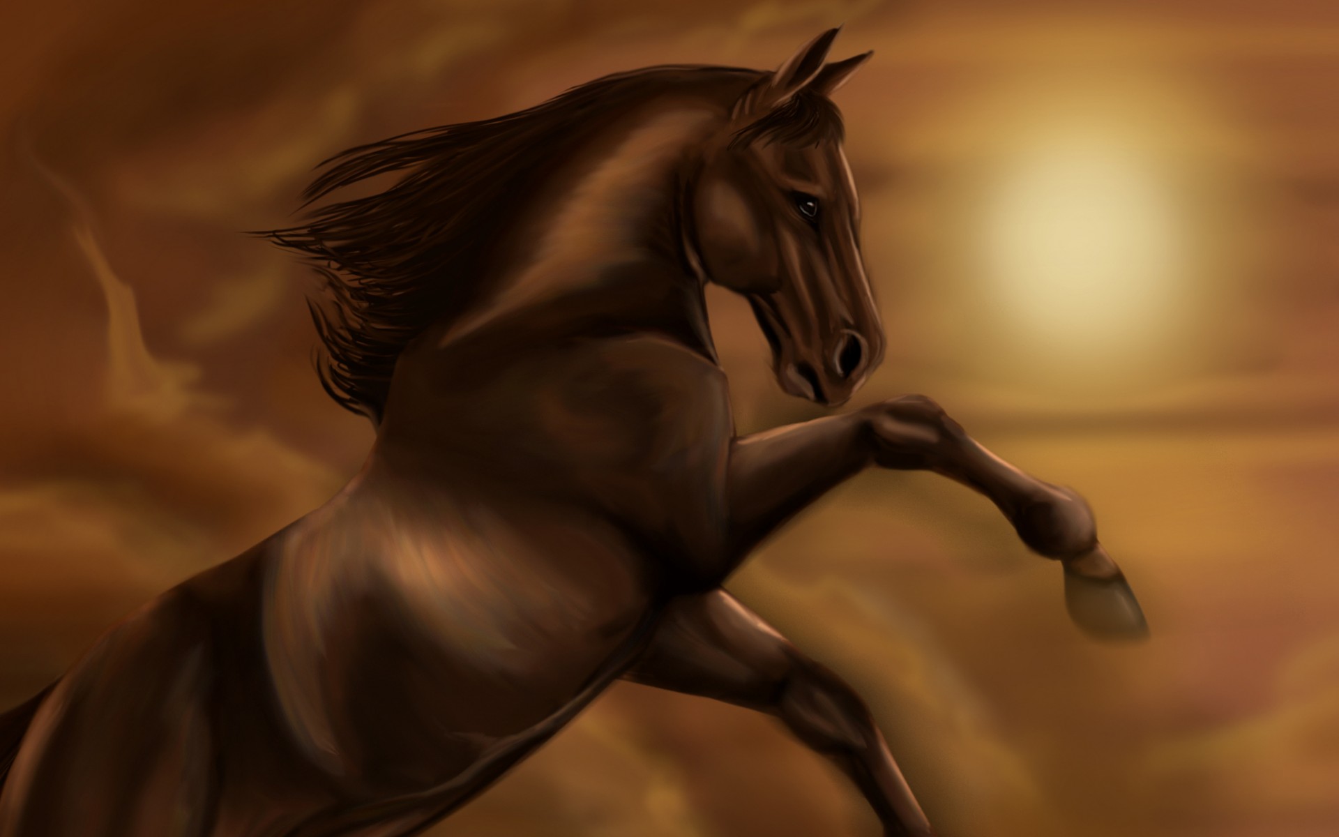Description: A horse is running in the air with its front legs spread out and it's head turned to the side.