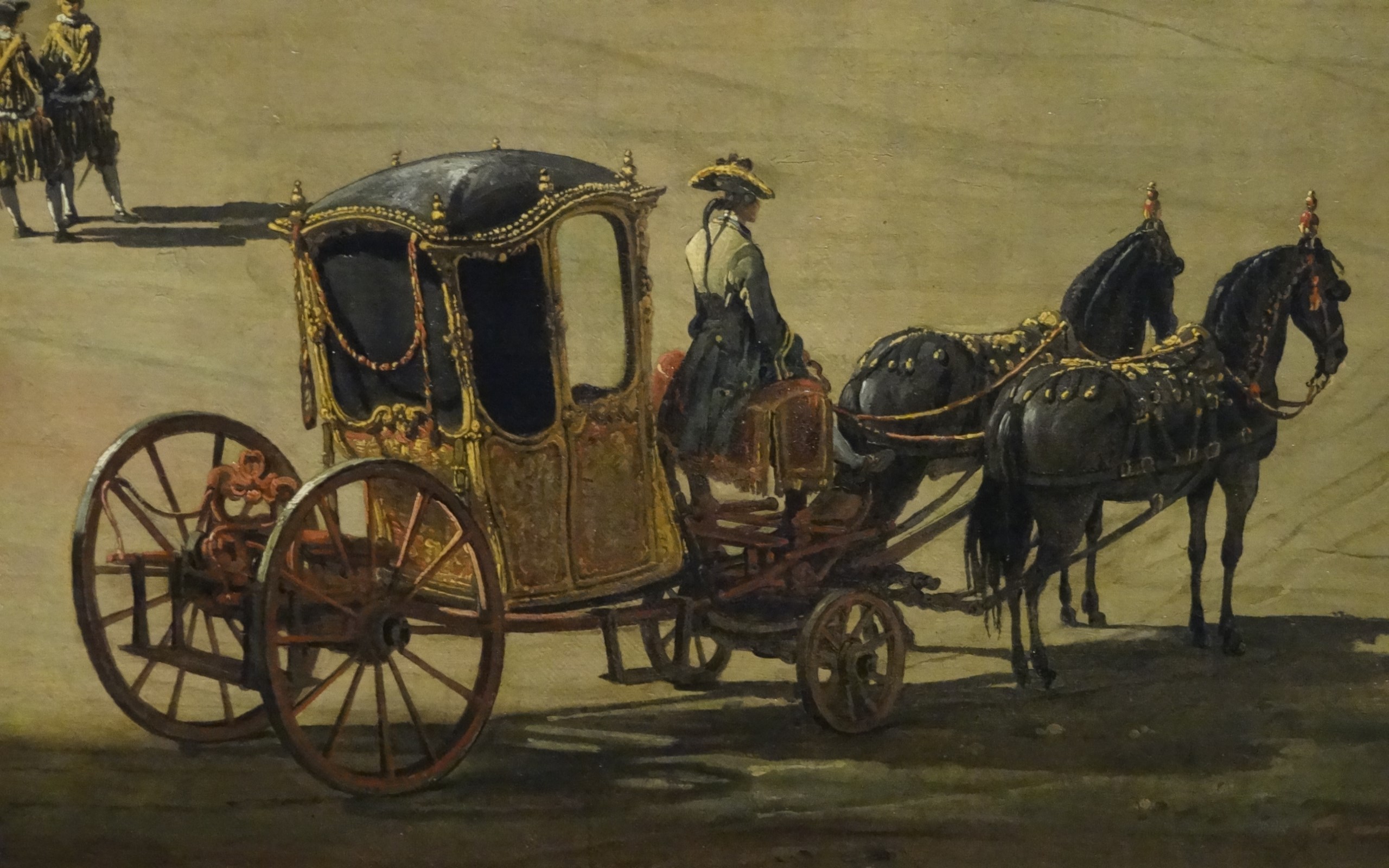 Description: A painting of a horse drawn carriage with two men riding on it and a woman in a white dress.
