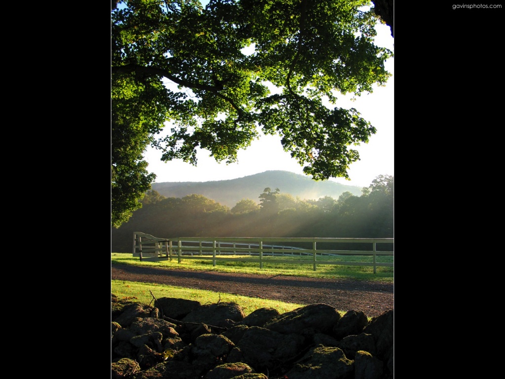Description: A horse is standing in a field near a fence and a tree with the sun shining through the trees.