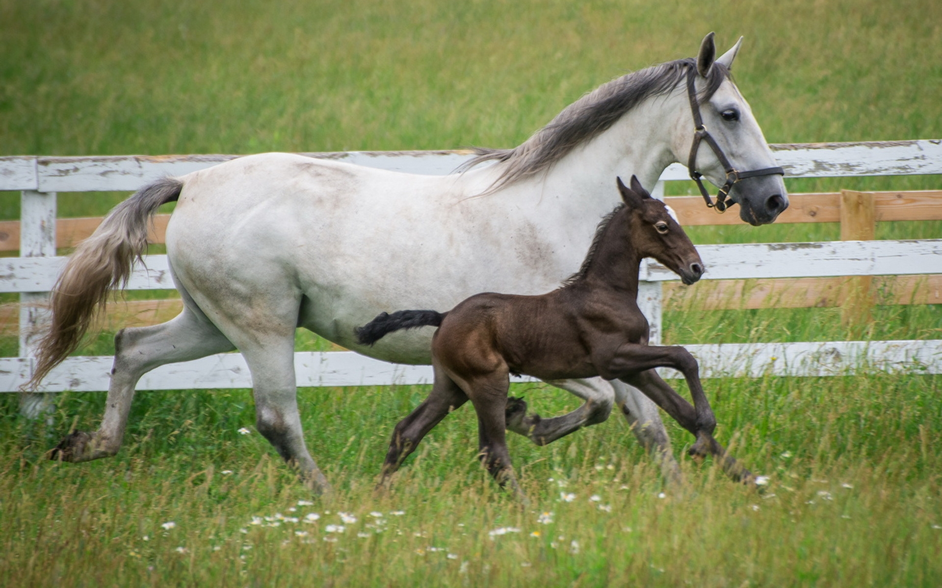 Description: A horse and a foal running in a field of grass and flowers near a fenced in area.