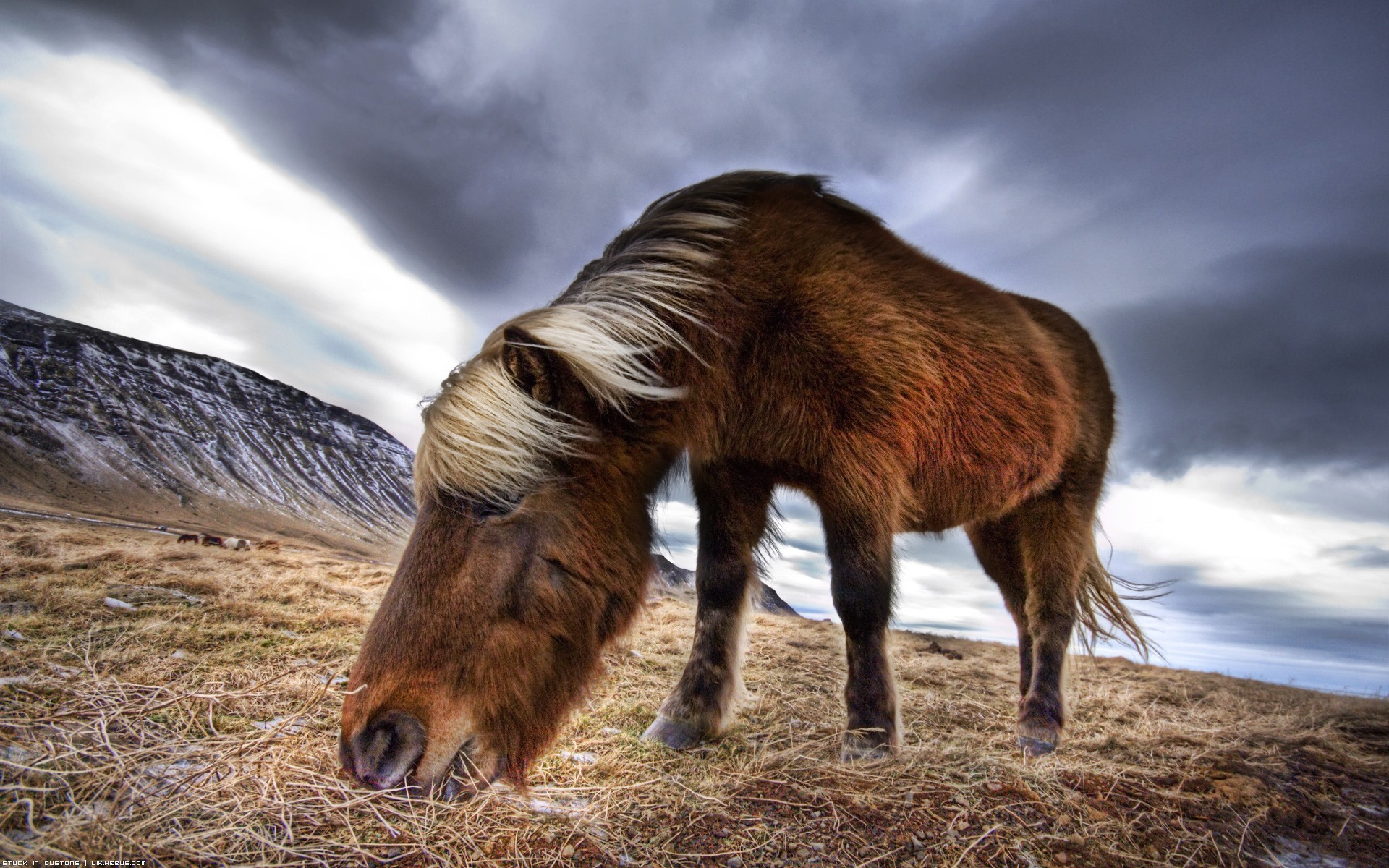 Description: A horse grazing on dry grass on a cloudy day in the mountains of scotland.
