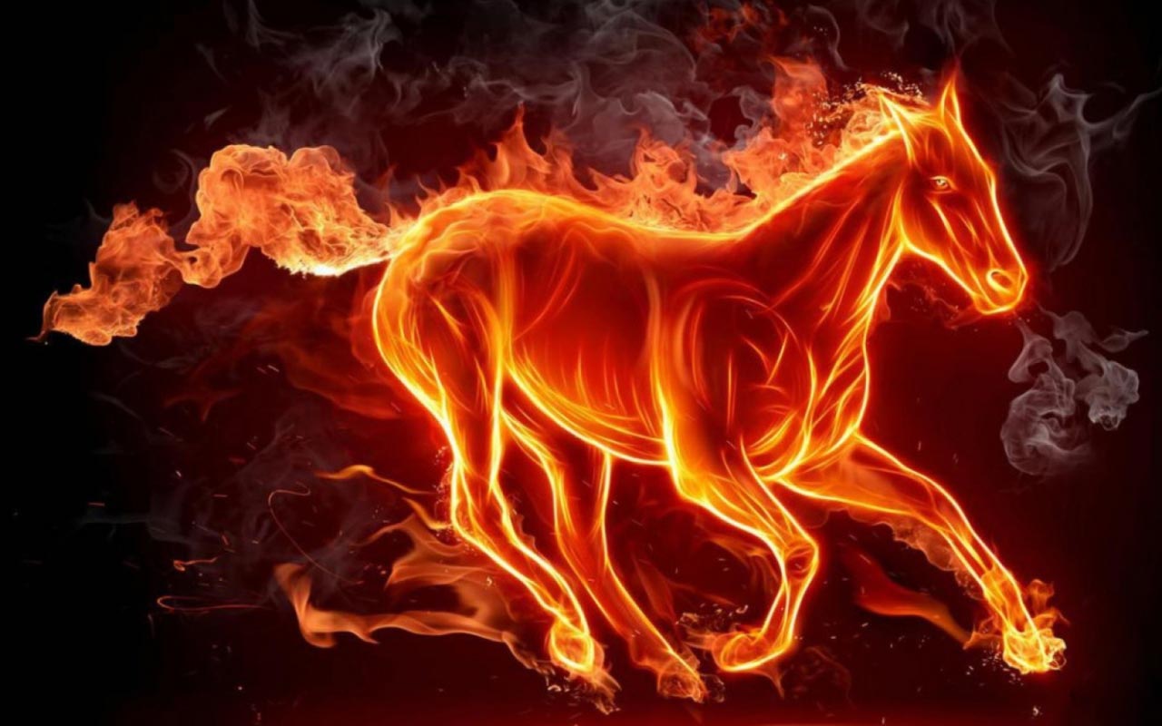 Description: A horse is running through a fire filled field of smoke and flames.