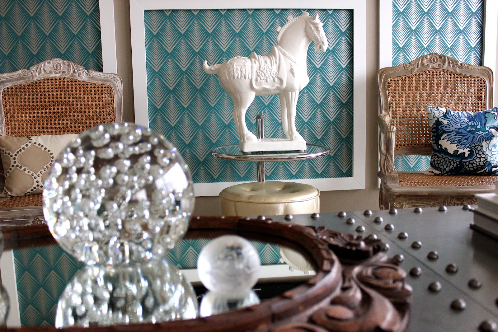 Description: A room with a horse statue on a table and a mirror on a table with a vase and a mirror on it.