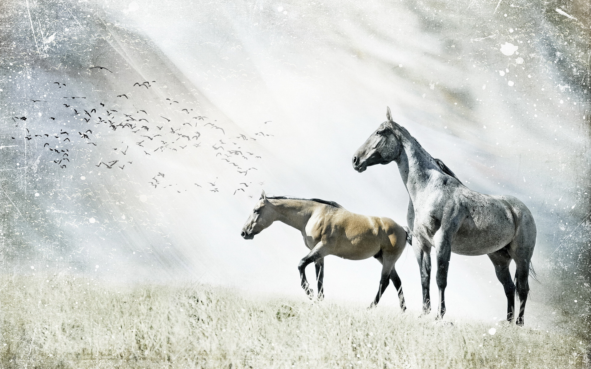 Description: Two horses standing in a field with birds flying overhead in the sky above them.