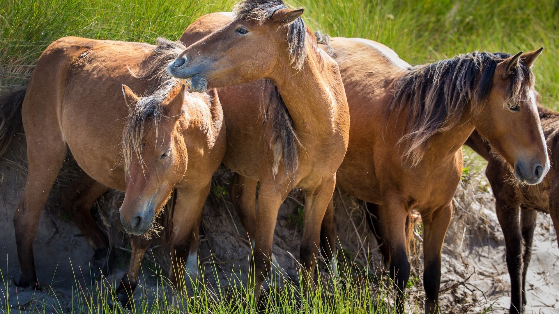 Description: A group of horses standing next to each other in a field of grass and dirt with tall grass behind them.