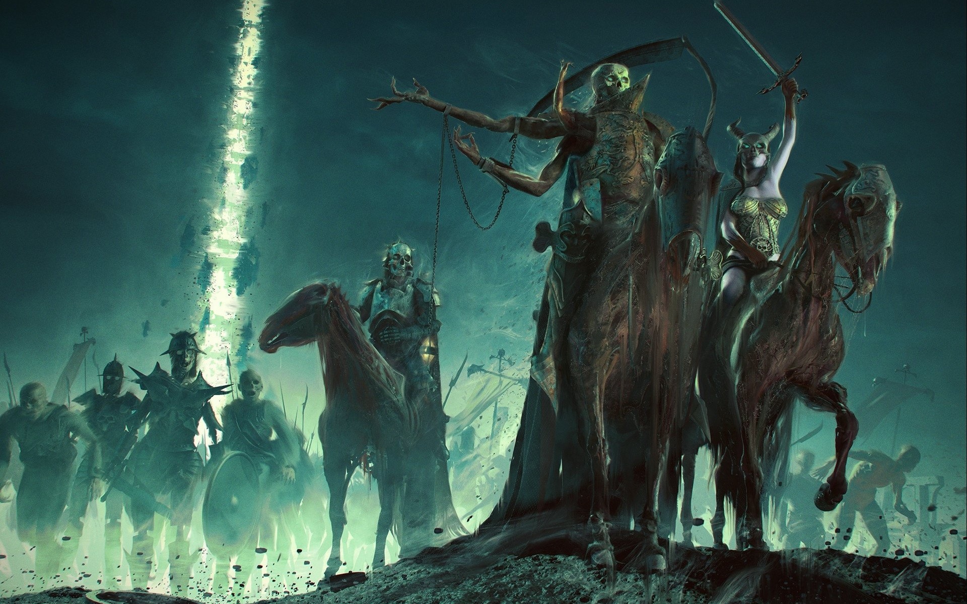 Description: A group of people riding horses in a field with a sky background and a green light coming from behind.