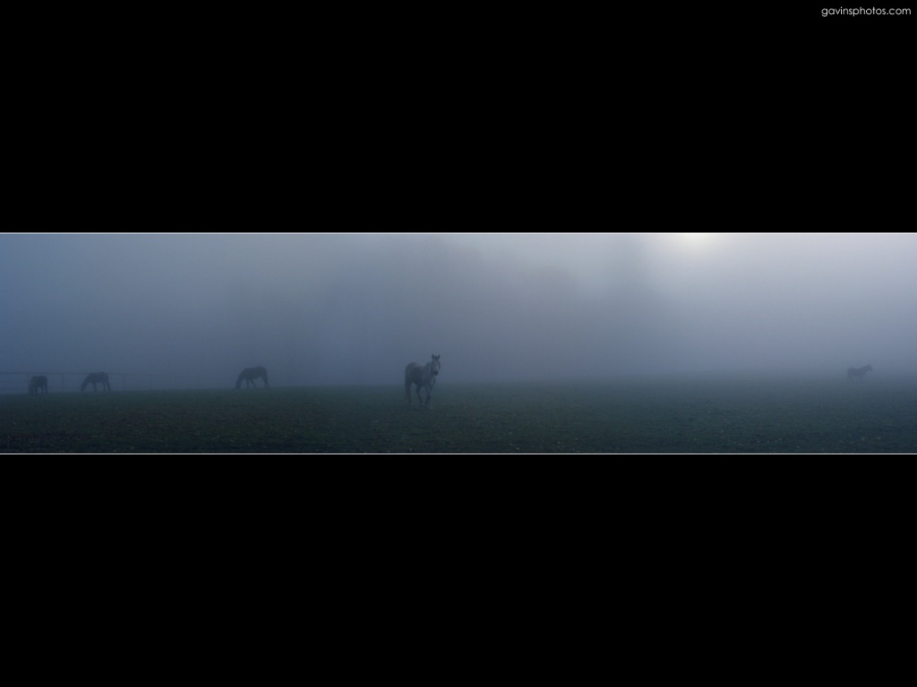 Description: A group of horses standing in a foggy field with a sky background and a black border around them.