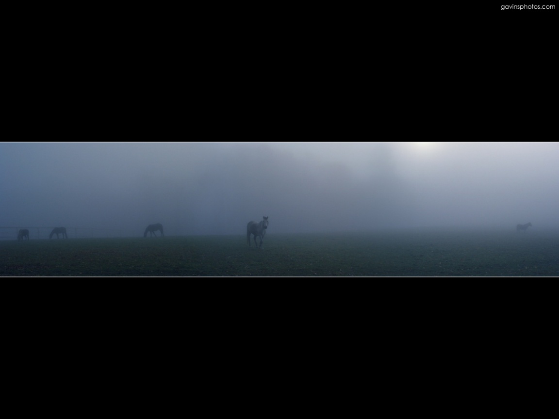 Description: A group of horses standing in a foggy field with a sky background and a black border around them.