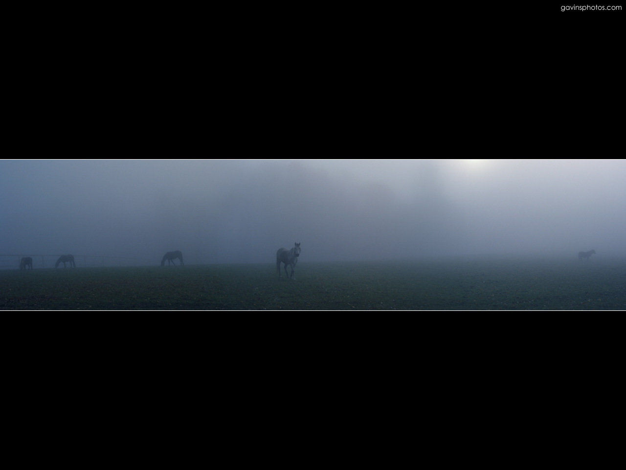 Description: A group of horses grazing in a foggy field with a black border around them and a black border around them.