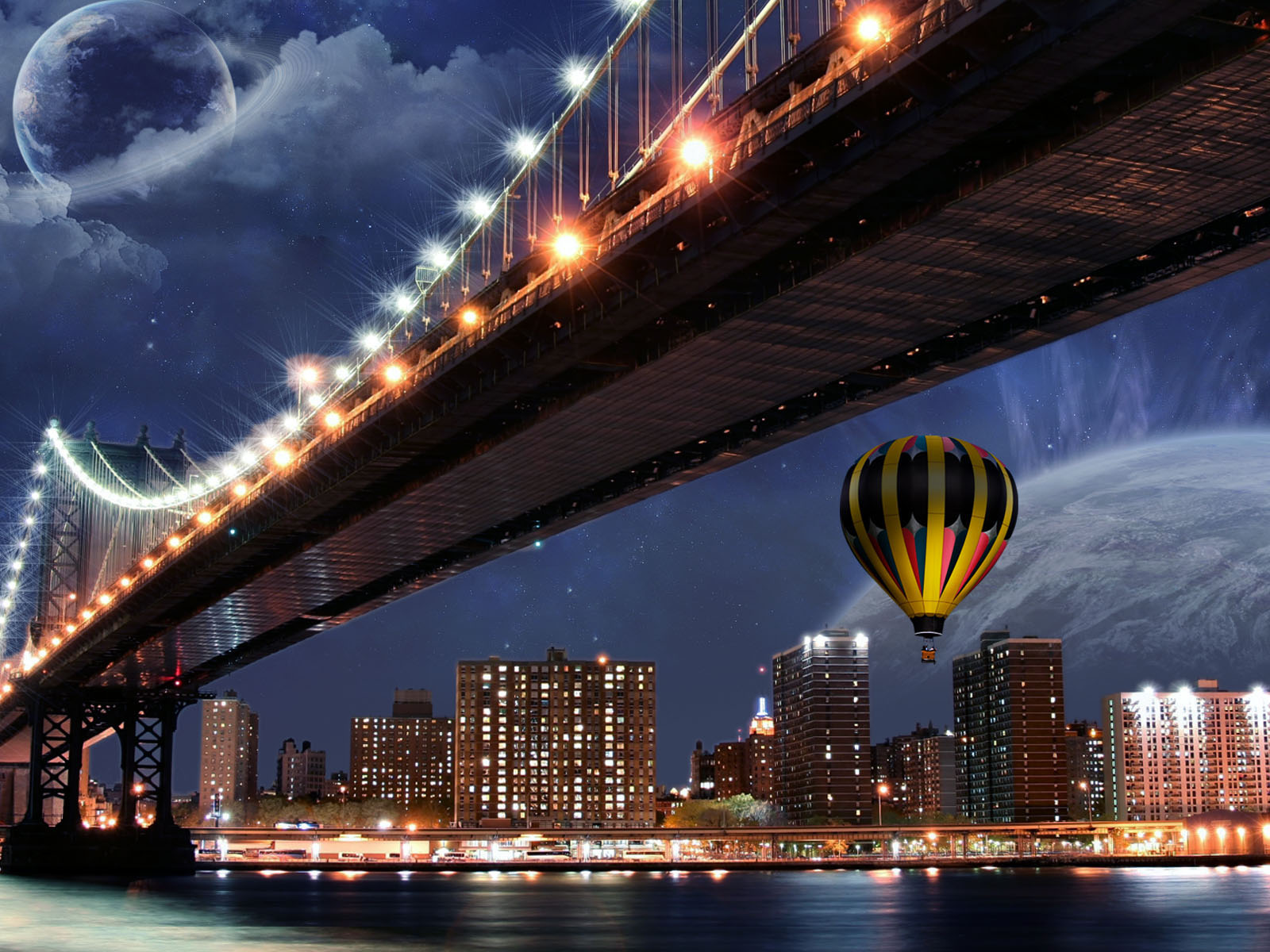 Description: A hot air balloon flying over a city at night with a bridge in the background and a city skyline.