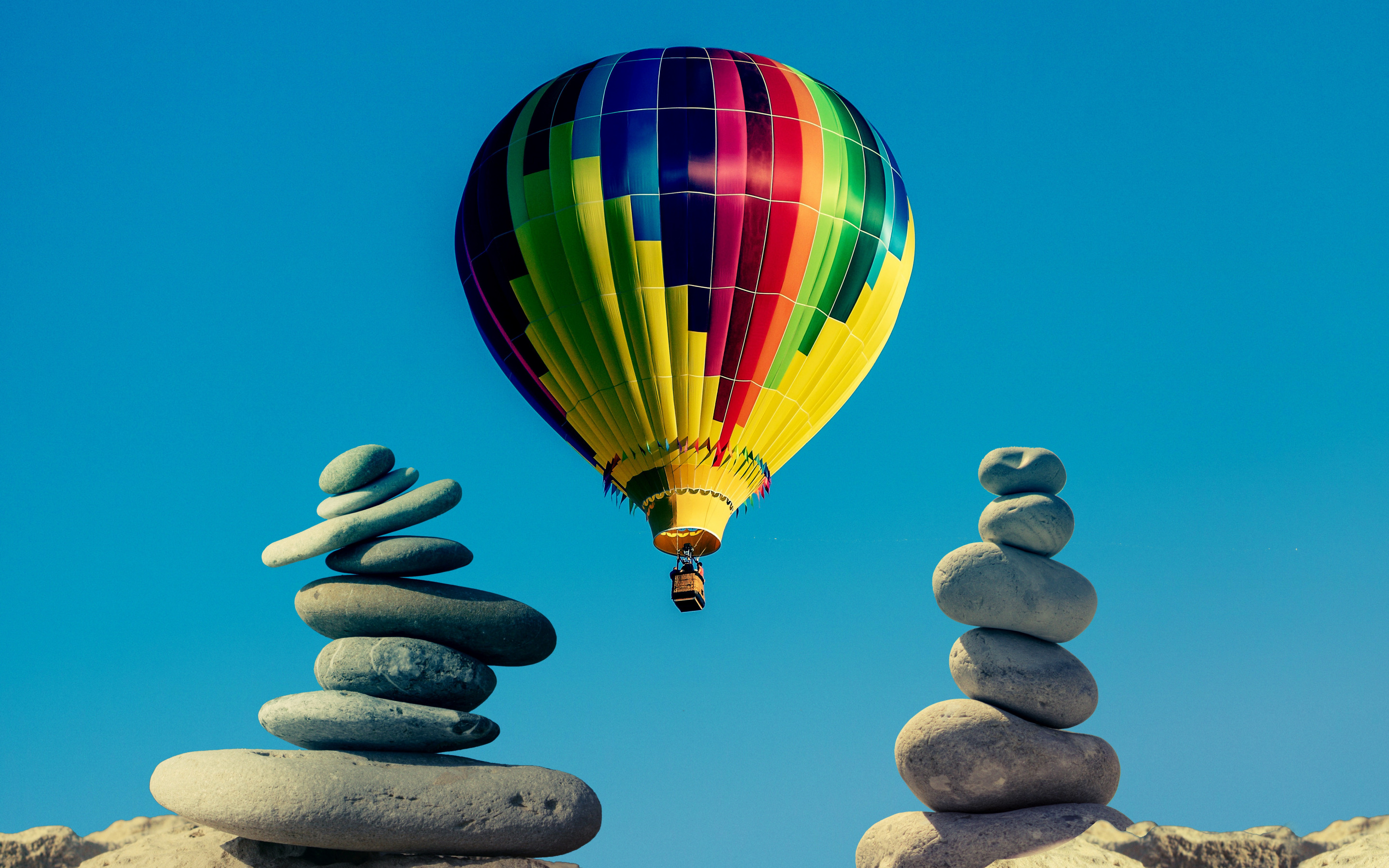 Description: A hot air balloon flying over a pile of rocks and rocks stacked on top of each other in the sky.