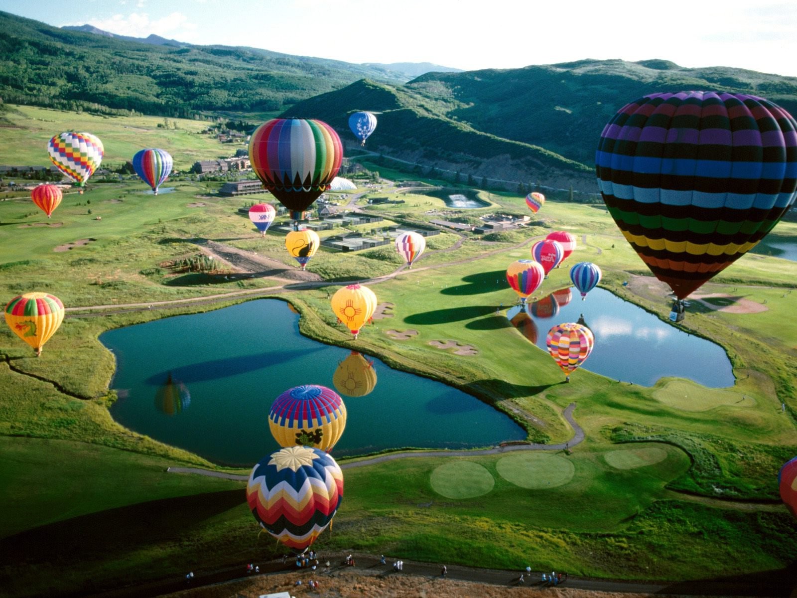 Description: A group of hot air balloons flying over a lake and mountains in the sky with a few others in the air.