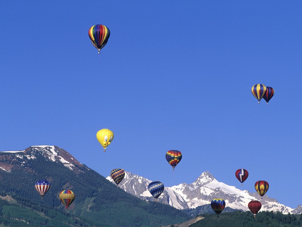 Description: A group of hot air balloons flying over a mountain range with snow capped mountains in the background in the distance.