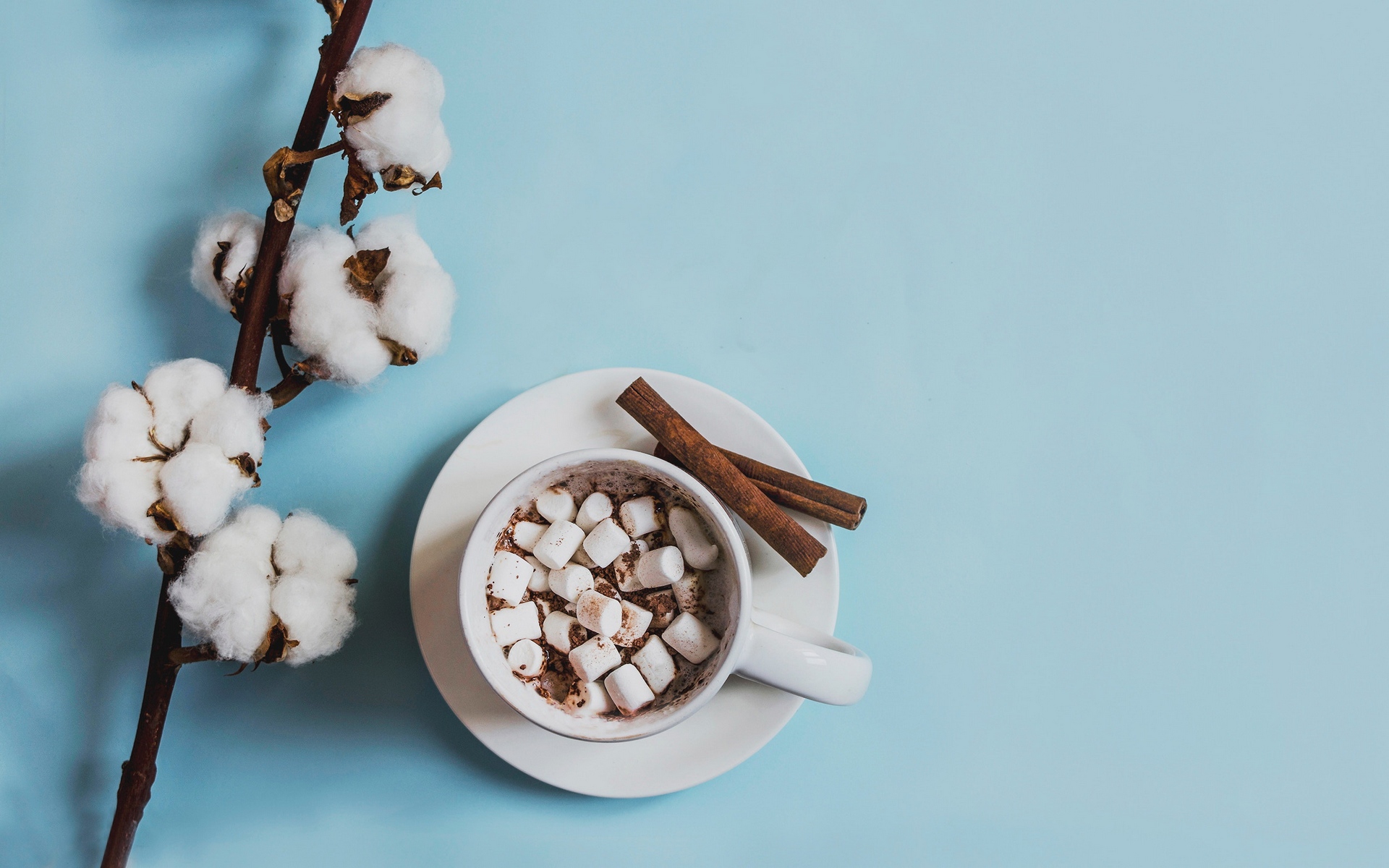 Description: A cup of hot chocolate and marshmallows on a blue background with cinnamon sticks and a branch.