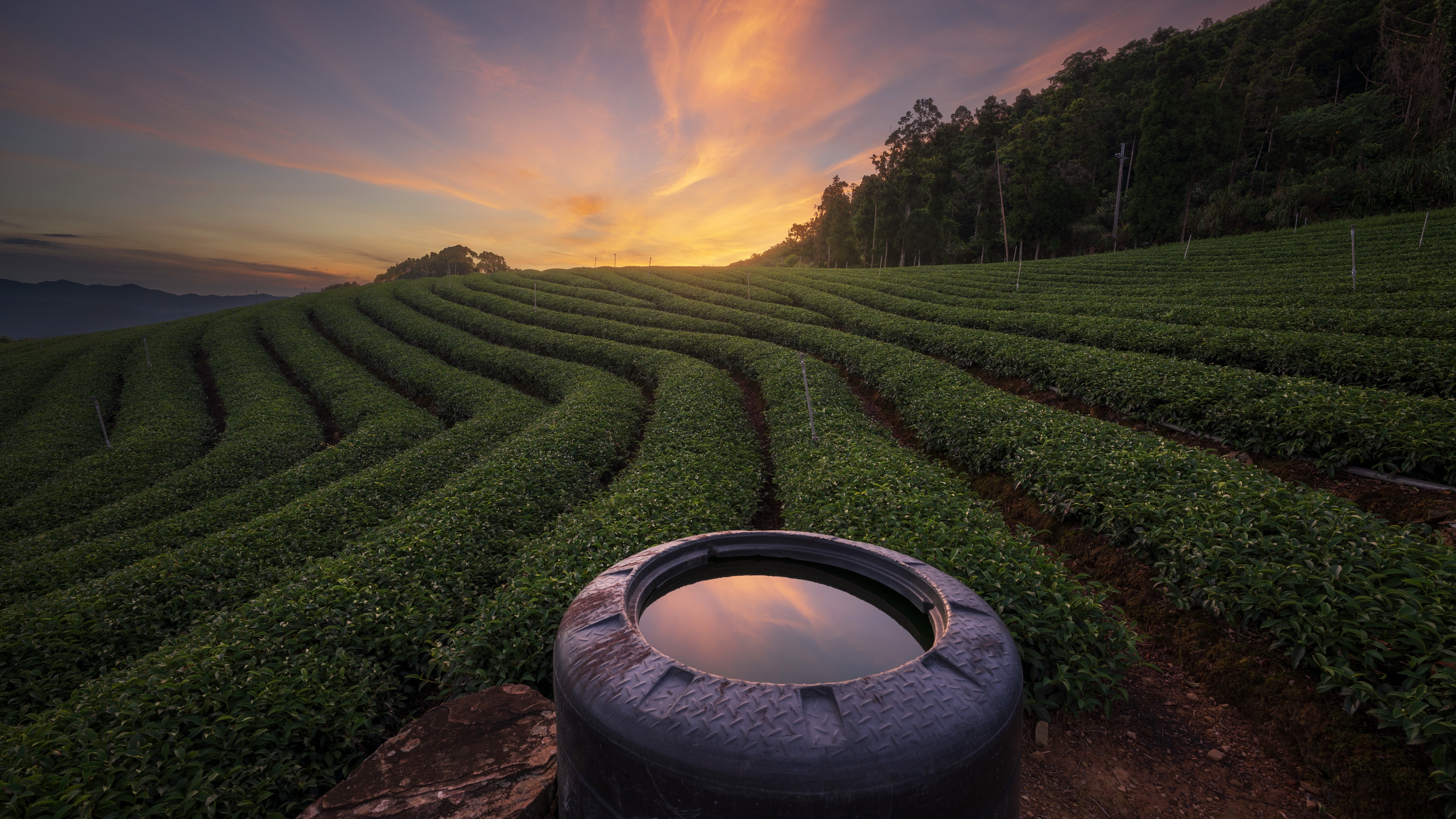 Description: A hot tub in a field of crops at sunset with a sunset in the background and a sky with clouds.