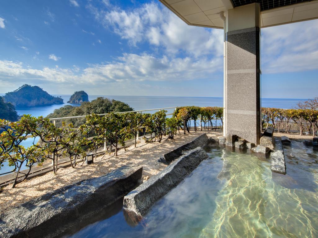 Description: A hot tub on a patio overlooking a body of water and a mountain range in the distance with trees and bushes.