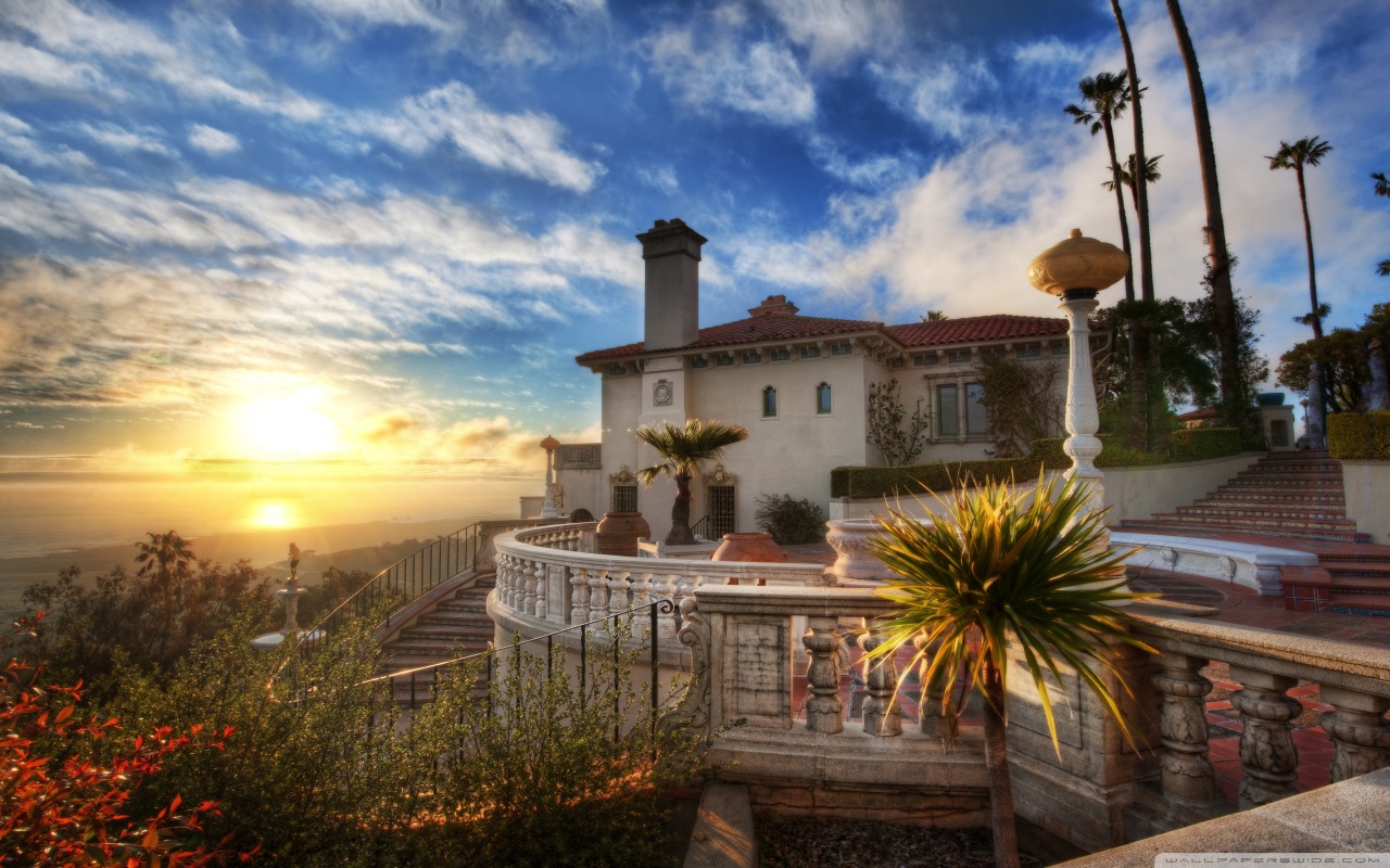 Description: A house with a balcony and a view of the ocean at sunset or sunrise or sunset over the ocean.