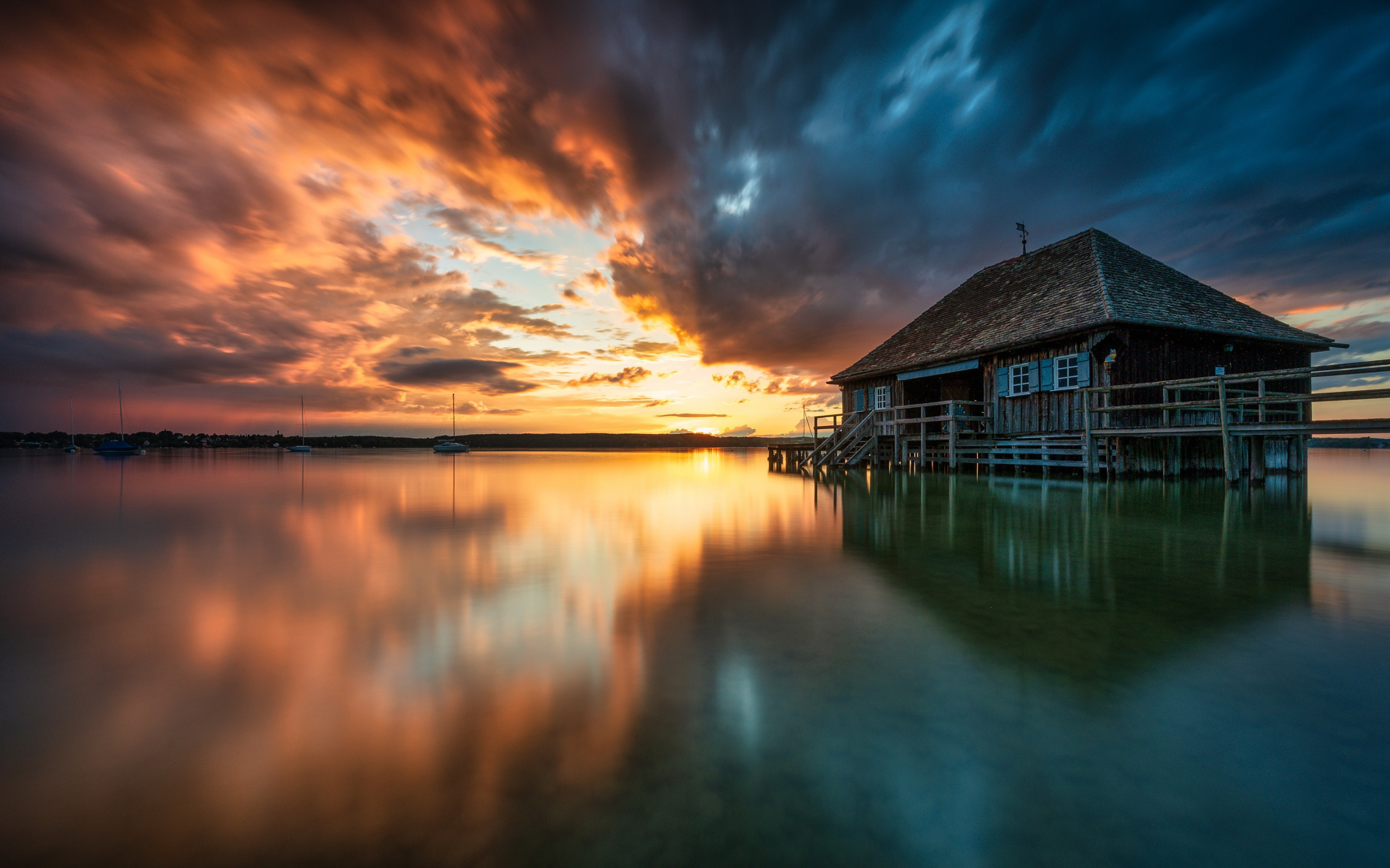 Description: A house on a dock with a sunset in the background and clouds in the sky above it and a body of water below.