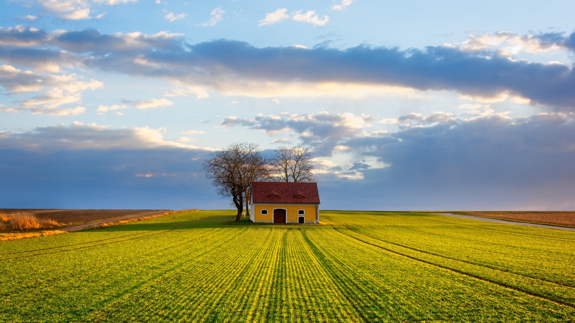 Description: A house in a field with a tree in the middle of it and a cloudy sky above it with a few clouds.