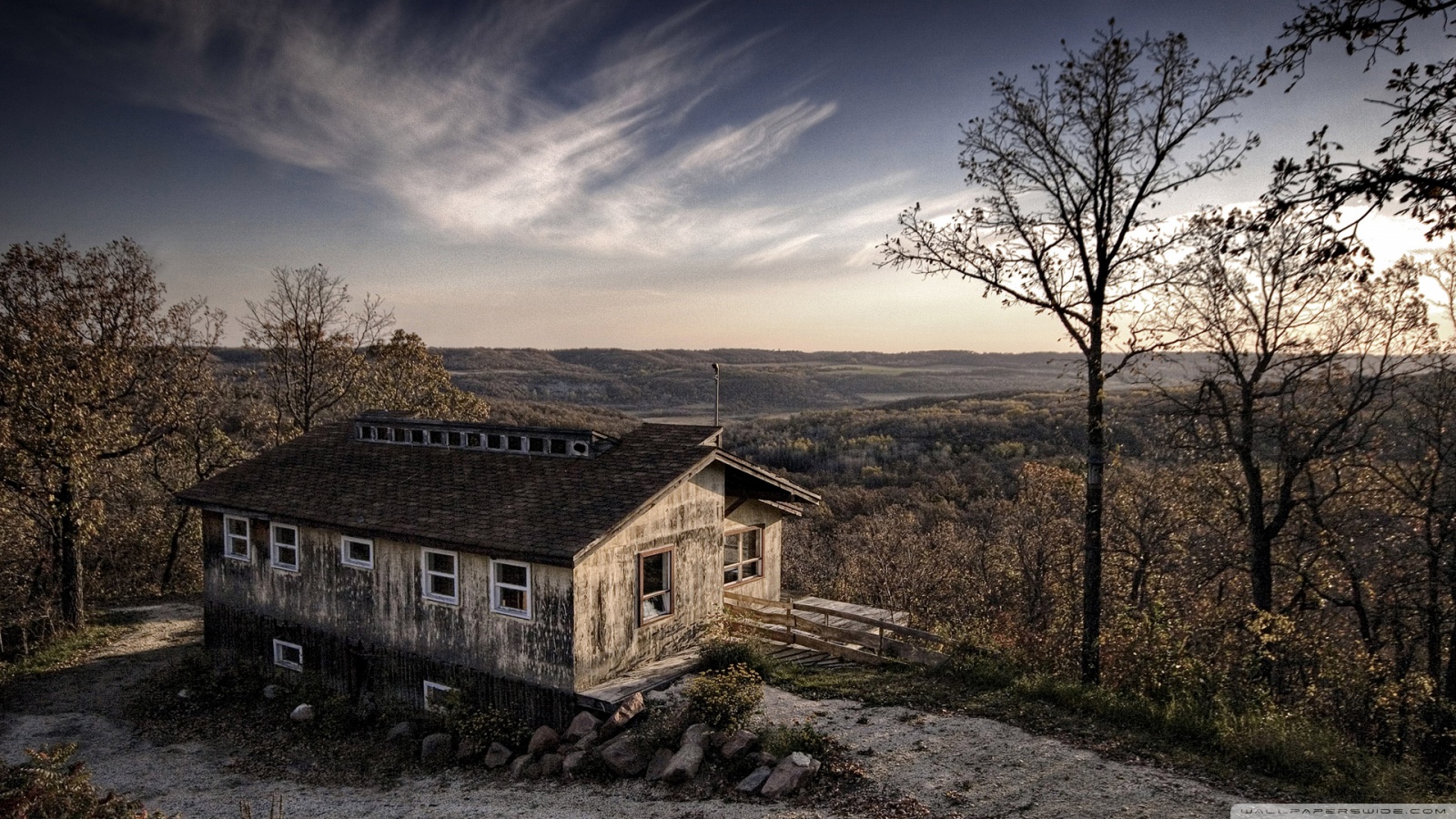 Description: A house on a hill with a view of the mountains in the background and a few trees in the foreground.