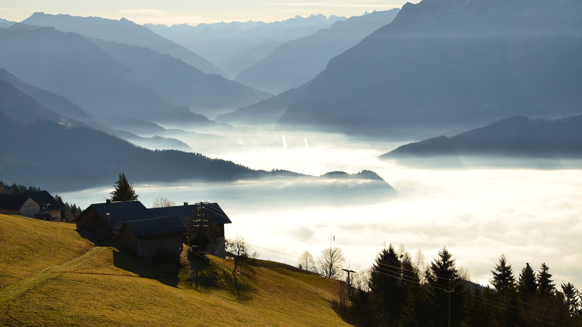 Description: A house on a hill with a view of mountains and valleys in the distance with fog in the air.