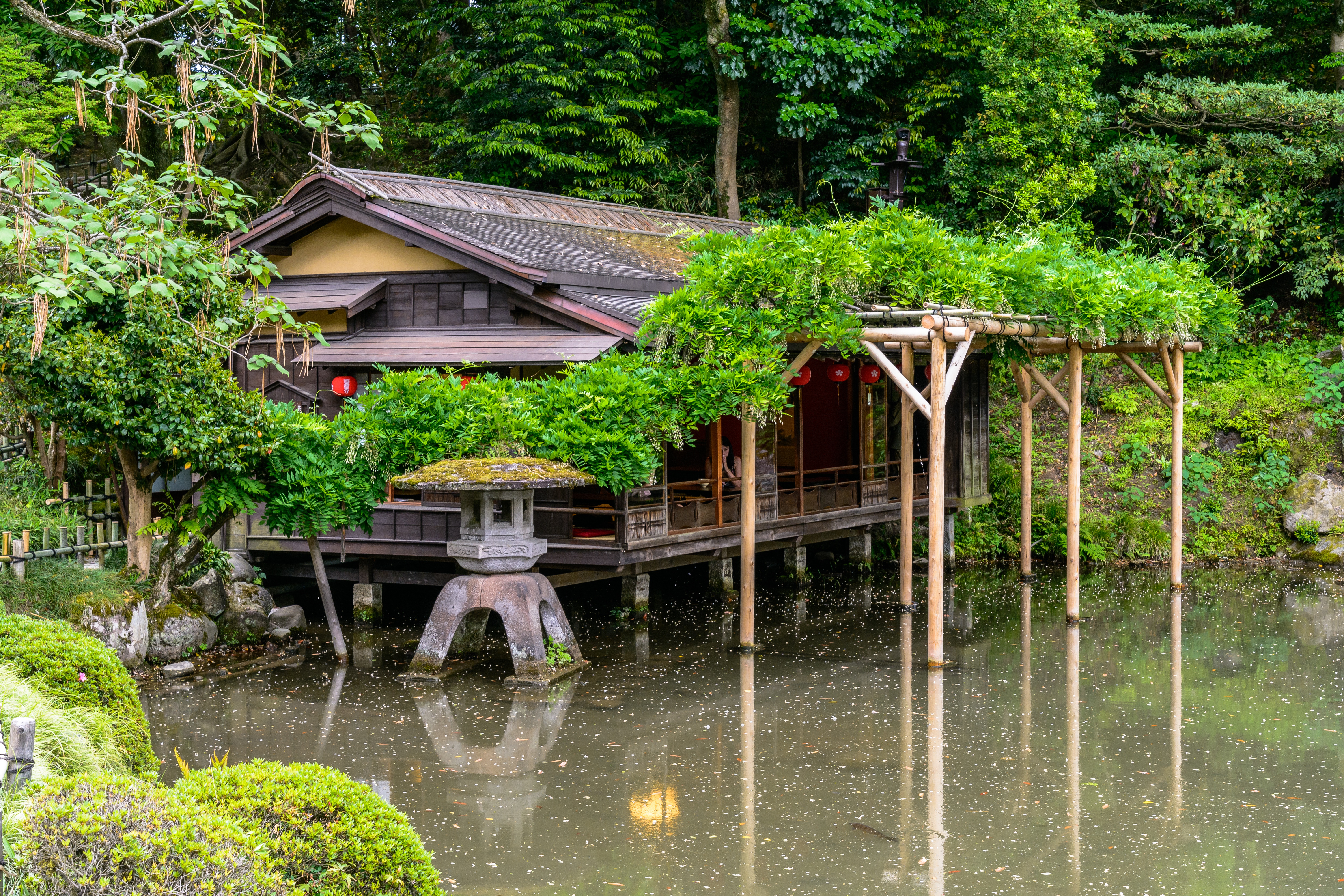 Description: A house in a pond surrounded by trees and bushes with a lantern in the middle of the pond and a lantern in the middle of the pond.