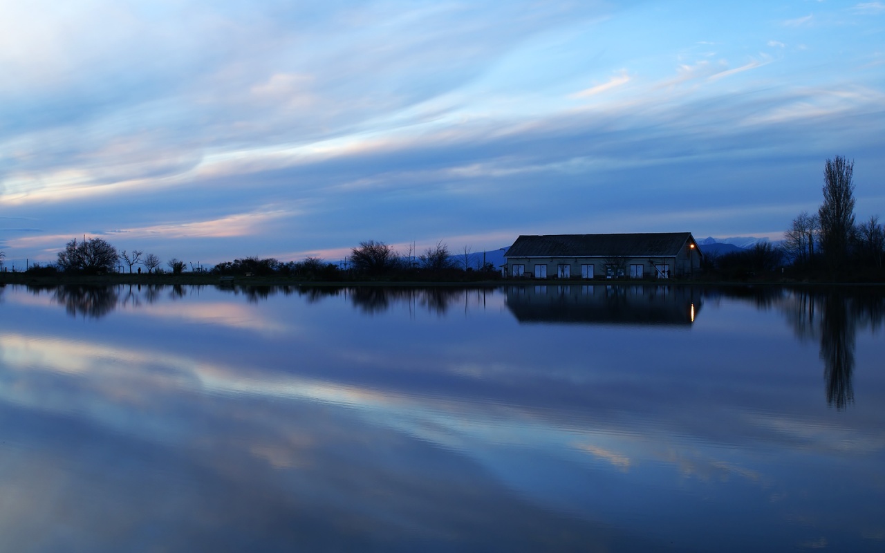 Description: A house is reflected in the still water of a lake at dusk with a blue sky and clouds reflected in the water.