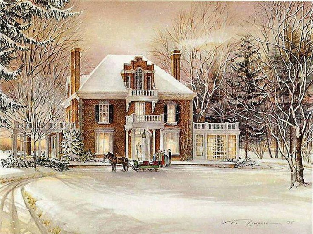 Description: A painting of a house in the snow with a horse and carriage in front of it and trees in the background.