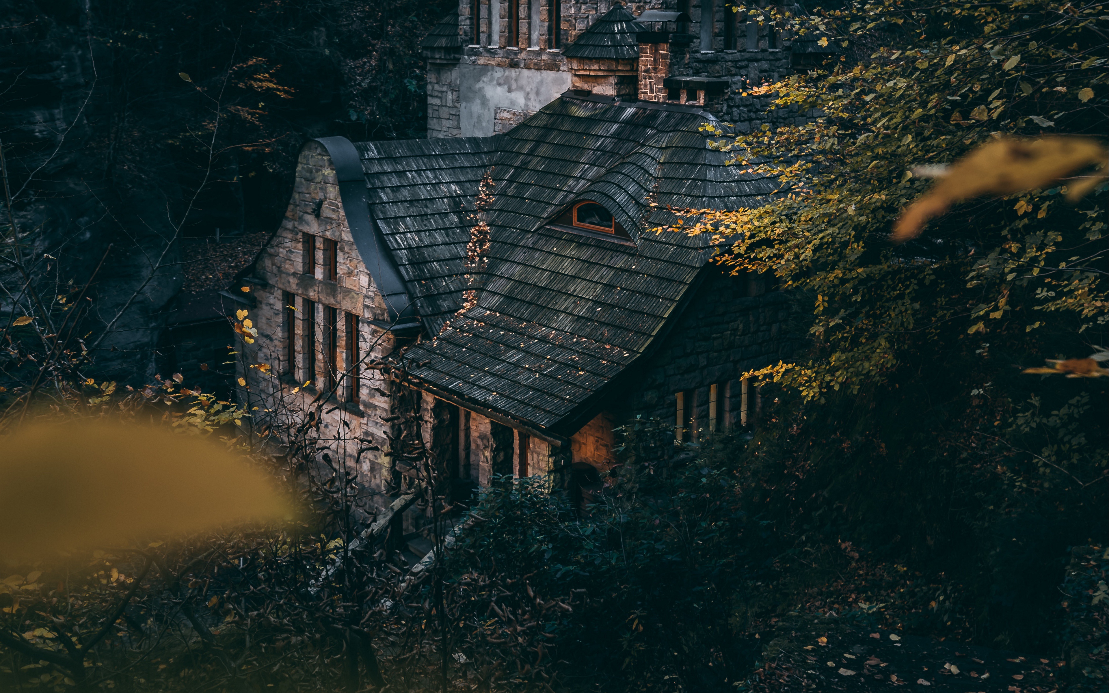 Description: A house with a roof made of stone and a brown shingled roof surrounded by trees and foliage in the fall.