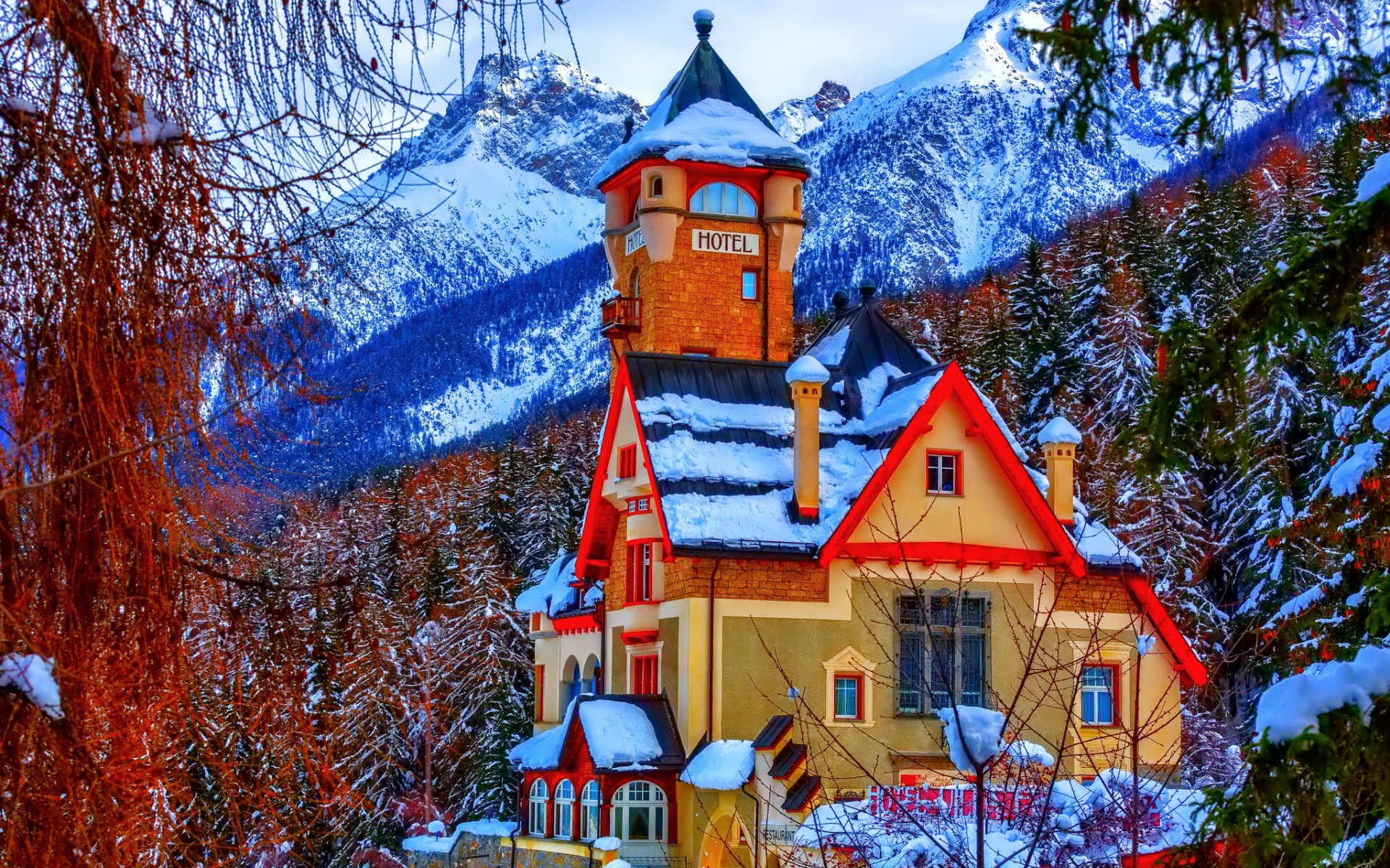 Description: A house with a tower in the middle of a snowy mountain range with trees and bushes in front of it.