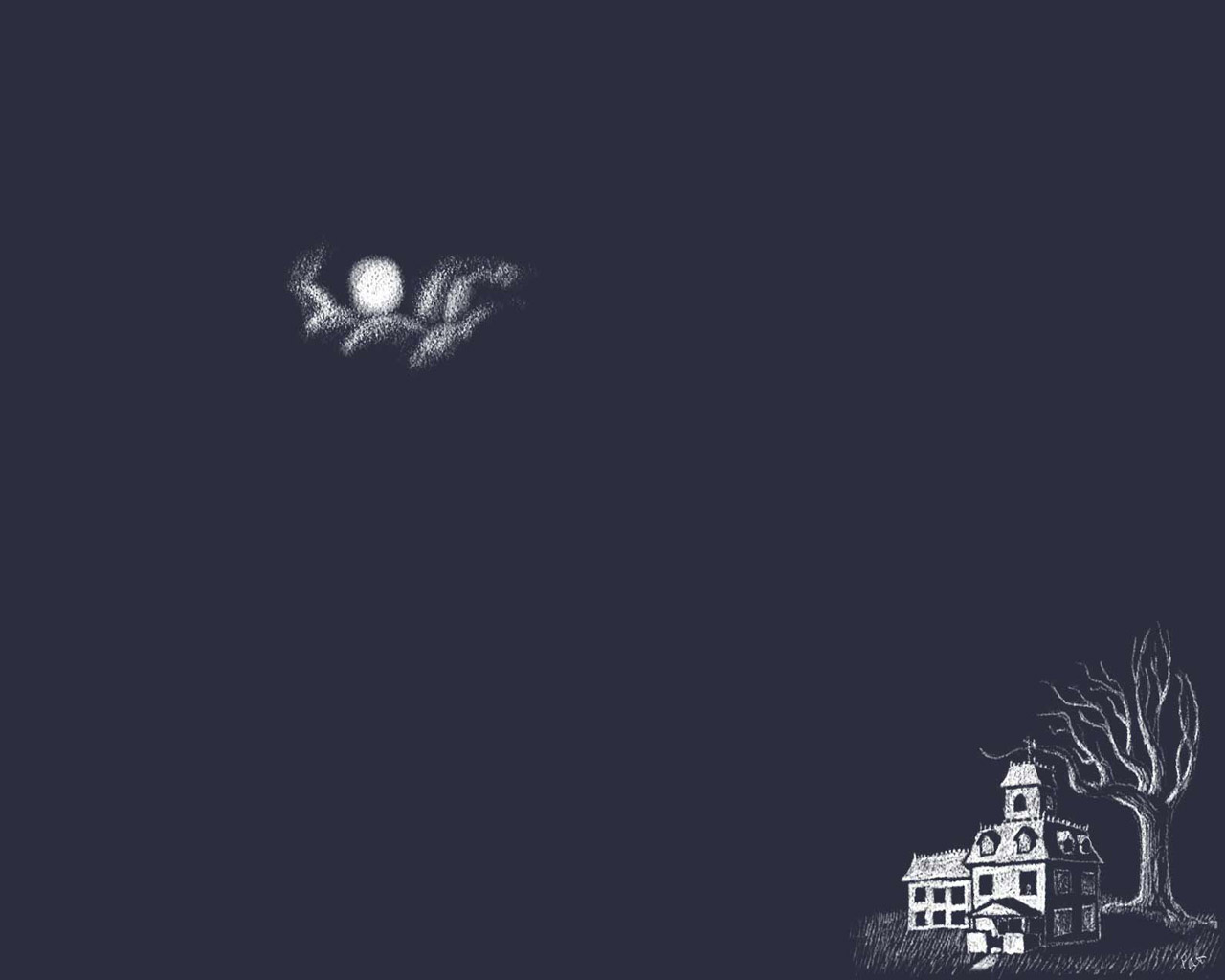 Description: A drawing of a house and a tree in the dark sky with a moon in the distance and a tree in the foreground.