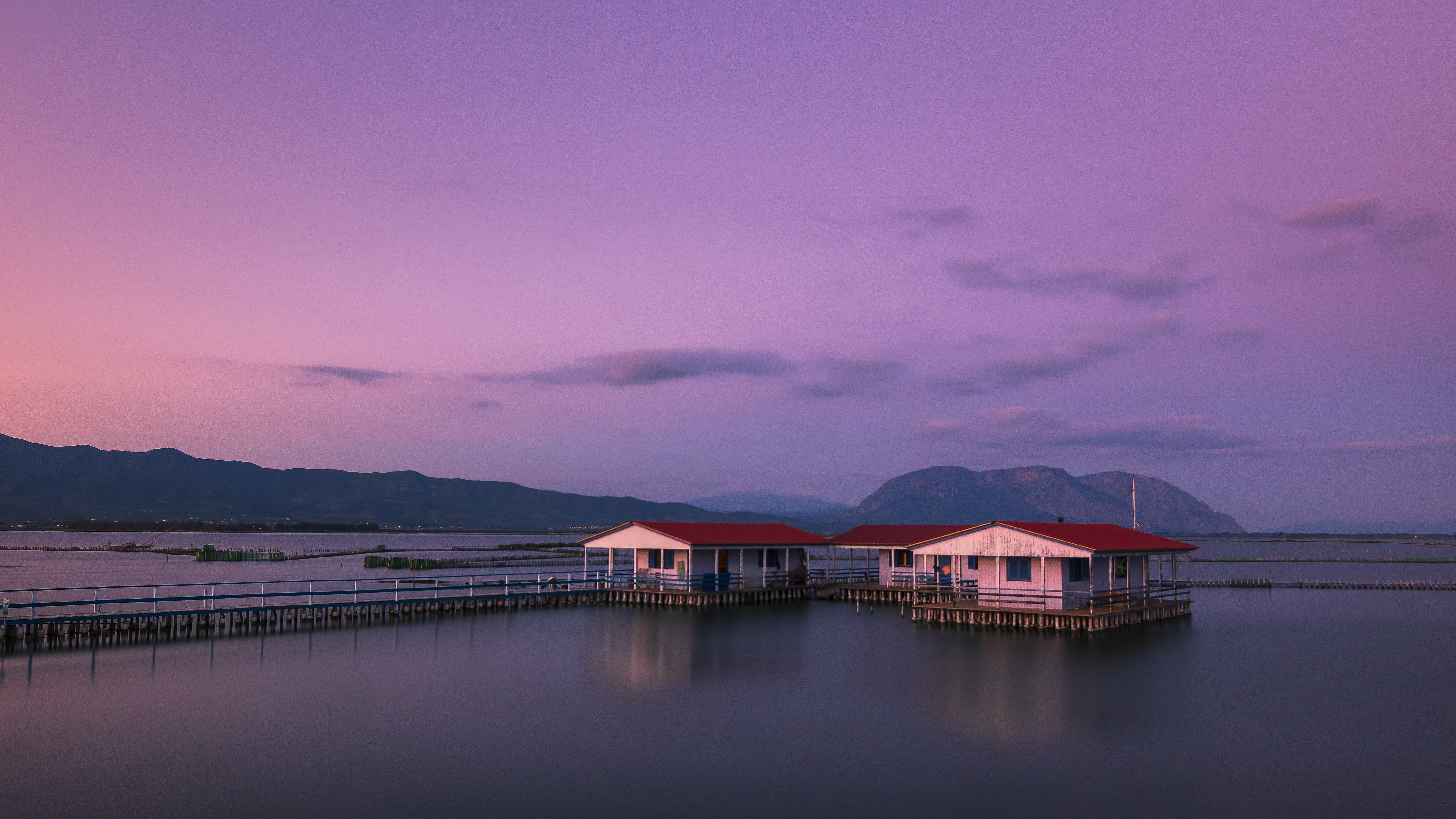 Description: A couple of houses sitting on top of a pier next to a lake at sunset with mountains in the background.