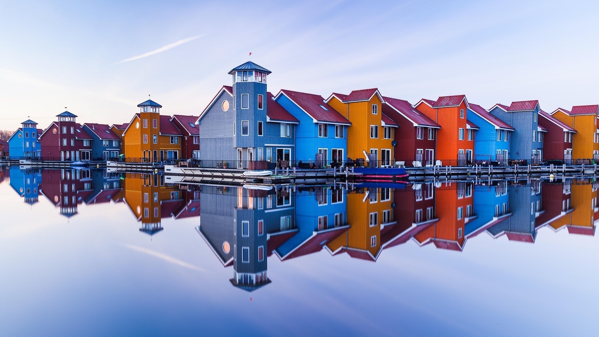 Description: A row of houses sitting next to a body of water with a clock tower on top of it's roof.