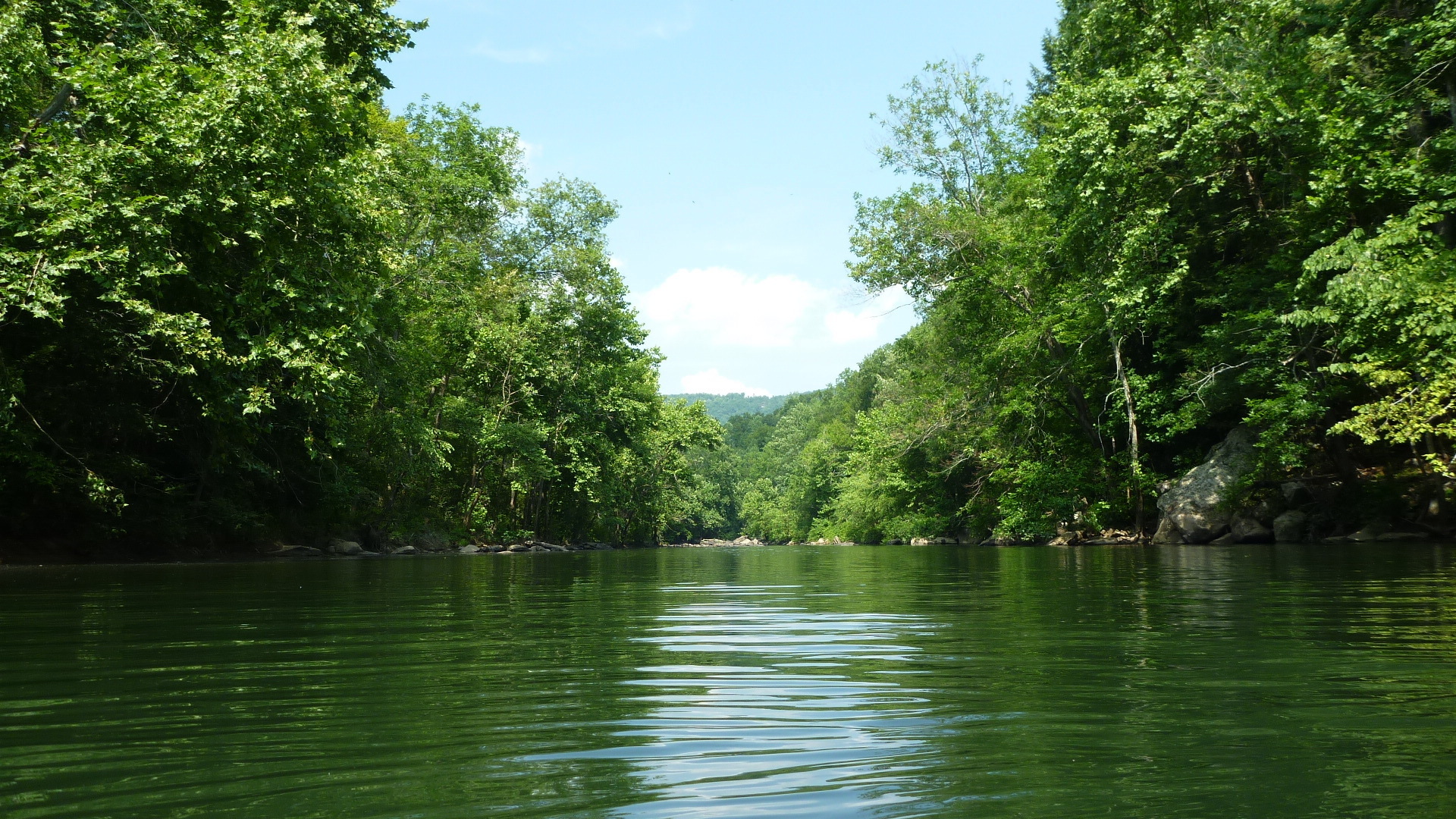 Description: A river with a boat on it surrounded by trees and rocks in the water and a blue sky above.